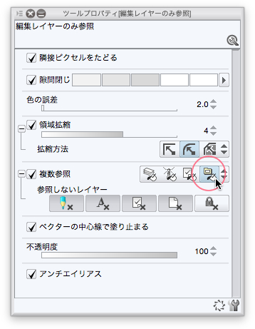 塗りつぶしツールパレットでの複数参照を「フォルダー内のレイヤー」にする