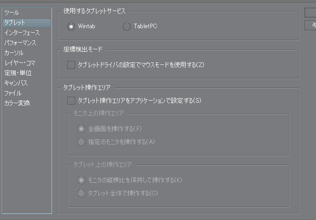 ・[ファイル]メニュー→[環境設定]を開き、[タブレット]、
