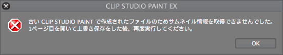12ページのグレースケールのマンガを作成し、pdfプラグインを使用して全ページ書き出しました。初回はうまくいったのですが、次にpsdファイルでも書き出した後、書き出し時の画質を変更したかったためもう一度プラグイン経由でpdfに書き出そうとしたところ、添付画像のようなエラーメッセージが出て不可能になりました。メッセージに従いましたが、改善されませんでした。 別の作品の複数ページファイルで書き出しを行ったところ、無事に終了し、また、今回問題になったファイルも、製作直後にCLIP STUDIO PAINT上から複製として保存してあったページ管理ファイルを開いて試行したところ、書き出しに成功しました。Finder上でのファイル操作は行っておりません。 psdファイルへの書き出しは全て成功します。 個別ページ・管理ファイル製作は全てバージョン1.6.2で行っており、lipファイルではありません。各clipファイルは異常なく展開でき、編集等に問題はありません。 セキュリティソフトは現在使用しておりません。 他にもPCを所有していますが、プラグインがマシン一台に一ライセンスだったと記憶しておりますので、検証できません。 お手数をおかけしますが、何らかのアドバイスがありましたらよろしくお願いいたします。 ・CLIP STUDIO PAINT EXのバージョン:1.6.2 ・PCの型番とメーカー名:Apple Mac Pro MA970J/A CPU 2 x 2.8 GHz Quad-Core Intel Xeon メモリ26GB 800 MHz DDR2 FB-DIMM ・セキュリティソフト名とバージョン:なし ・ペンタブレットの型番とドライババージョン:Intuos Pro PTH-651/K1 ドライババージョン6.3.15-3 ・作成いただいている原稿のサイズと単位、解像度:仕上がりサイズB5判 mm単位 グレースケール 600dpi ・作品ファイルの保存場所: 内蔵HDD(空き容量約1TB) ![]() ![]() ------------------------------------------------------------ ■バージョン: ※Windowsは、[ヘルプ]メニュー → [バージョン情報]で確認できます。 ※MacOSXは、[CLIP STUDIO PAINT]メニュー → [バージョン情報]で確認できます。 1.6.2 ■グレード DEBUT( ) comico( ) PRO( ) EX(○) ■OS Windows XP( ) Windows Vista( ) Windows 7 ( ) Windows 8( ) Windows 8.1( ) Windows 10( ) MacOS X 10.5( ) MacOS X 10.6( ) MacOS X 10.7( ) MacOS X 10.8( ) MacOS X 10.9(○) MacOS X 10.10( ) MacOS X 10.11( ) mac OS 10.12( ) その他( ) ------------------------------------------------------------ |