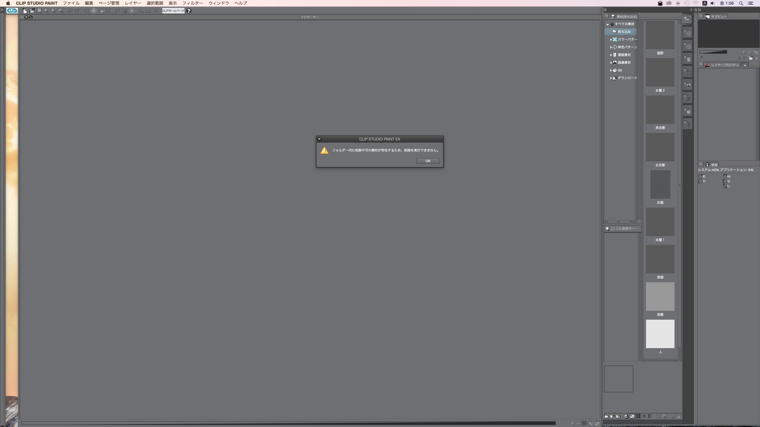 作品の制作で主に使っていたトーンを素材として登録してフォルダを作ったのですが、消去ができません。 フォルダを選択して消去を選択すると[フォルダー内に削除不可の素材が存在するため、削除できません]の表示が出ます。 フォルダ内で一つ一つ消去しようとしたのですが、全てゴミ箱マークが選択できなくなっていました。 消去方法を教えてほしいです。 ------------------------------------------------------------ ■バージョン: ※Windowsは、[ヘルプ]メニュー → [バージョン情報]で確認できます。 ※MacOSXは、[CLIP STUDIO PAINT]メニュー → [バージョン情報]で確認できます。 ■グレード DEBUT( ) comico( ) PRO( ) EX( ⚪︎ ) ■OS Windows XP( ) Windows Vista( ) Windows 7 ( ) Windows 8( ) Windows 8.1( ) Windows 10( ) MacOS X 10.5( ⚪︎ ) MacOS X 10.6( ) MacOS X 10.7( ) MacOS X 10.8( ) MacOS X 10.9( ) MacOS X 10.10( ) MacOS X 10.11( ) mac OS 10.12( ) その他( ) ------------------------------------------------------------ |
