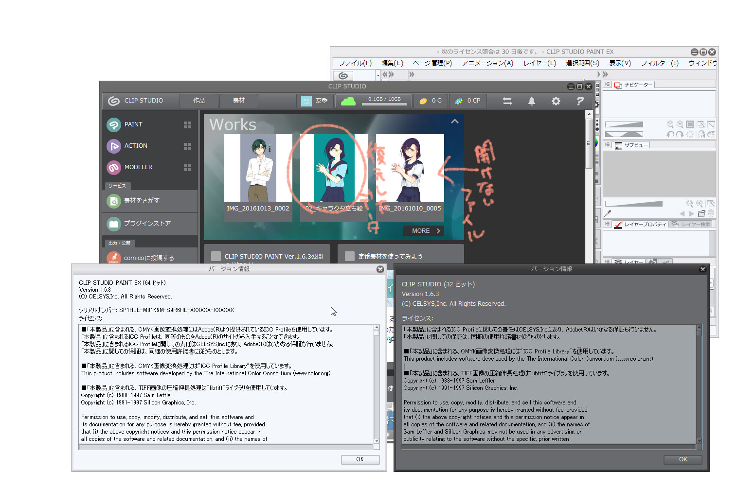 10/27に制作した.clip形式の画像を破損を恐れ、「Dropbox」「外付けHDD①」「外付けHDD②」に複製しました。 コピーしたファイルは開けることを確認しております。 その後、起動したCLIPSTUDIOがデータの更新を求めたため、更新をかけ、10/28に新規の.clip形式の画像を作成開始しました。作成中に10/27に作業したファイルを開こうとしたところ、「対応ファイル形式ではありません」とダイアログがでました。 その後、「Dropbox」「外付けHDD①」「外付けHDD②」3つのファイルすべてを確認しましたが、すべて「対応形式ではありません」と表示され、開くことが出来なくなりました。 開く前には確認を行っていなかったのですが、すべて0KBになっており、データそのものがない、という表示になっておりました。 CLIPSTUDIOのスタートメニューからはサムネイルが確認できるものの、開けず、 バックアップファイルの中から探ったものの、同じ状態までの復元が難しい状態です。 この状態からのデータの復元は難しいのでしょうか。 おてすうですがご返答いただけましたら幸いです。 ![]() ------------------------------------------------------------ ■バージョン: ※Windowsは、[ヘルプ]メニュー → [バージョン情報]で確認できます。 ※MacOSXは、[CLIP STUDIO PAINT]メニュー → [バージョン情報]で確認できます。 ■グレード DEBUT( ) comico( ) PRO( ) EX( ○ ) ■OS Windows XP( ) Windows Vista( ) Windows 7 ( ○ ) Windows 8( ) Windows 8.1( ) Windows 10( ) MacOS X 10.5( ) MacOS X 10.6( ) MacOS X 10.7( ) MacOS X 10.8( ) MacOS X 10.9( ) MacOS X 10.10( ) MacOS X 10.11( ) mac OS 10.12( ) その他( ) ------------------------------------------------------------ |