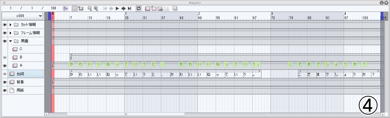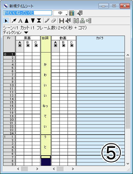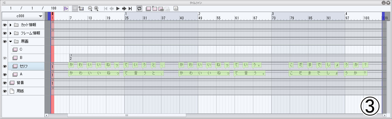 タイムラインに「台詞欄」が無いので、以下を試みてみました。 暫定処置1: タイムラインの「ラベル」を使って台詞を入力してみましたが、誤入力の修正が出来ないし タイムラインの表示幅に合わせて文字間にスペースを入れると文字数制限に引っかかり長文が入力できません。【画像1】 更に、タイムラインの表示幅を変更すると「セリフ」のタイミングが合わなくなり使えません。【画像2】 ![]() ![]() 暫定処置2: 一文字毎に「ラベル」を使って台詞を入力してみました。これだとタイムラインの表示幅を変えてもズレは生じませんが、 タイミングを変更したい場合はラベルの位置修正が出来ないので、ラベルの削除/作成し直しの手間が辛いです。【画像3】 ![]() 暫定処置3: レイヤーを消費しない「ラベル」は諦めて、アニメーションセルフォルダーで別途「台詞」を作りました。 以下の参考記事の入力方法の応用で、一文字毎の入力はラベルより難度が下がりました。 ラベルと比べてタイミングの変更可能や誤入力も直し易くなりましたが、一文字入力の辛さは変わりません。【画像4】 ![]() 基本的には中身のレイヤーは不要ですが、仮名セルを選択して「新規アニメーションセル」ボタンをクリックすると、 その名称のレイヤーが作成されるって、ちょっと便利で何かに使えそう… 要望: 例えばタイムライン上に「台詞欄」とかを作って、 STYLOSの様に長文を入力または流し込むだけで、自動的に3フレームずつ配置される機能が欲しいです。【画像5】 「台詞」はタイムシート作成時に原画のタイミングを決める一つの目安として大事な要素です。 ![]() 宜しくお願いします。 ------------------------------------------------------------ ■バージョン:1.6.3 ■グレード:EX ■OS:Windows 10 ------------------------------------------------------------ |