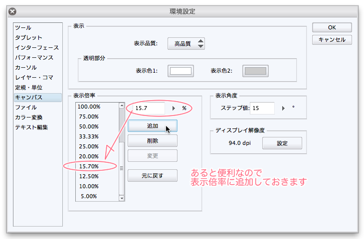 先ほどの環境設定の表示倍率の項目にこの数値を加えます
