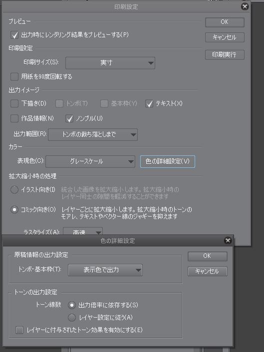 いつも大変お世話になっております。 今回、アナログからなんの知識もないままデジタルに初挑戦し、わからないことは何度もこのサイトを確認し、解決してきました。 が。。 やっと一枚描きあがったものの、書き出し、印刷あたりで壁にぶちあたってしまいました。。。 まず、グレーで塗ってトーン化をする手法で仕上げました。 そして書き出しはPSDにて書き出しを行いました。 そこでグレーで塗ったにもかかわらずモアレ?のように見えるのがちらほら。。。 そこで、書き出し→印刷(自宅の複合機です) と行ってみましたが、グレーで塗った場所のモアレはまったくなく、 安心したのですが、印刷で出力したものはすごく全体的に濃くなってモニターと全然違う仕上がりに。。。 これはなにかで調節することができるのでしょうか? 一応画像を載せます。 ←全体的に濃くなったためトーンが潰れてしまってますちなみにB5が仕上がりサイズなのですが、100%表示だとすごく大きく表示されますよね。。。? その場合、原寸表示させたい場合はどうするのかも教えて頂きたいです。 お手すきの際にでも教えてくださいますと幸いです。 よろしくお願いいたします。 とりとめのない文章で申し訳ありません。 ------------------------------------------------------------ ■バージョン1.6.3 ※Windowsは、[ヘルプ]メニュー → [バージョン情報]で確認できます。 ※MacOSXは、[CLIP STUDIO PAINT]メニュー → [バージョン情報]で確認できます。 ■グレード DEBUT( ) comico( ) PRO( ) EX( ○ ) ■OS Windows XP( ) Windows Vista( ) Windows 7 ( ) Windows 8( ) Windows 8.1( ) Windows 10( ○ ) MacOS X 10.5( ) MacOS X 10.6( ) MacOS X 10.7( ) MacOS X 10.8( ) MacOS X 10.9( ) MacOS X 10.10( ) MacOS X 10.11( ) mac OS 10.12( ) その他( ) ------------------------------------------------------------ |