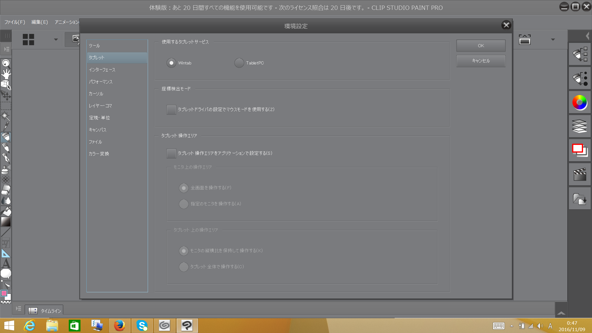 ・[ファイル]メニュー→[環境設定]を開き、[タブレット]と