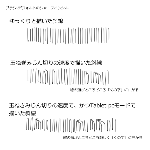 素早く細かい斜線を描くと、線の頭が「くの字」に曲がる |