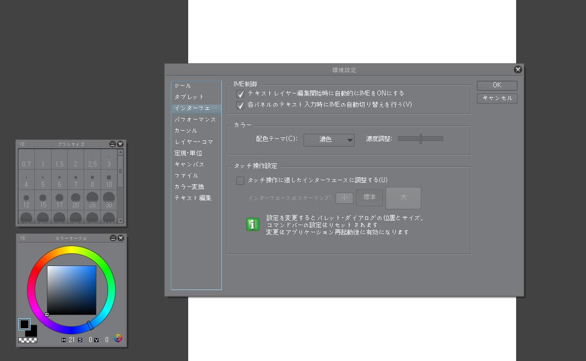 ・[ファイル]メニュー→[環境設定]を開き、[インターフェース]を