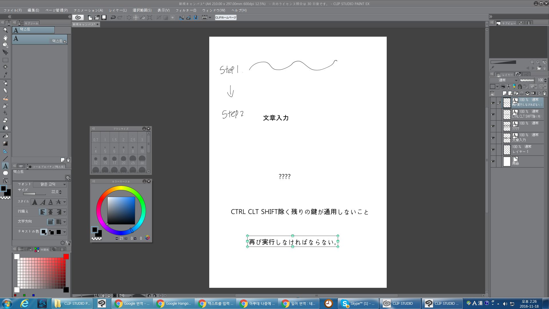 、本来使っていた1.3バージョンでは問題がありませんでした。 しかし、アップデート以降、1.6バージョンでテキスト入力後、 全てのショートカットキーが入力されない現象が発生しました。 原因を探すことができず、現在英語バージョンを購入して使用しています。 早い解決をお願いします。 ------------------------------------------------------------ ■バージョン: ※Windowsは、[ヘルプ]メニュー → [バージョン情報]で確認できます。 ※MacOSXは、[CLIP STUDIO PAINT]メニュー → [バージョン情報]で確認できます。 ■グレード DEBUT( ) comico( ) PRO( ) EX( 0 ) ■OS Windows XP( ) Windows Vista( ) Windows 7 ( 0 ) Windows 8( ) Windows 8.1( ) Windows 10( ) MacOS X 10.5( ) MacOS X 10.6( ) MacOS X 10.7( ) MacOS X 10.8( ) MacOS X 10.9( ) MacOS X 10.10( ) MacOS X 10.11( ) mac OS 10.12( ) その他( ) ------------------------------------------------------------ |