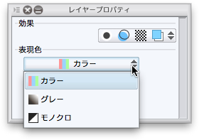 レイヤーパレットで表現色を「カラー」又は「グレー」にしてみてください