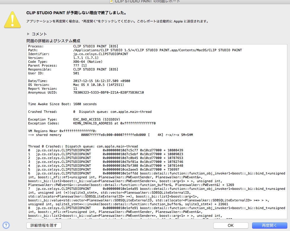 以前買ってインストールしたクリスタがいろいろサポートしていただいてもペイントツール以外使用不可能な状態だったので、マシンを変えて、以前のクリスタを削除しもう一度ソフトを買い直してダウンロードしてみたのですが、今度はインストールの画面も出ず、エラーになります ------------------------------------------------------------ ■バージョン: ※Windowsは、[ヘルプ]メニュー → [バージョン情報]で確認できます。 ※MacOSXは、[CLIP STUDIO PAINT]メニュー → [バージョン情報]で確認できます。 ■グレード DEBUT( ) comico( ) PRO( ◯) EX( ◯ ) ■OS Windows XP( ) Windows Vista( ) Windows 7 ( ) Windows 8( ) Windows 8.1( ) Windows 10( ) MacOS X 10.5( ) MacOS X 10.6( ) MacOS X 10.7( ) MacOS X 10.8( ) MacOS X 10.9( ) MacOS X 10.10( ◯ ) MacOS X 10.11( ) mac OS 10.12( ) その他( ) ------------------------------------------------------------ ------------------------------------------------------------ ■バージョン: ※Windowsは、[ヘルプ]メニュー → [バージョン情報]で確認できます。 ※MacOSXは、[CLIP STUDIO PAINT]メニュー → [バージョン情報]で確認できます。 ■グレード DEBUT( ) comico( ) PRO( ) EX( ) ■OS Windows XP( ) Windows Vista( ) Windows 7 ( ) Windows 8( ) Windows 8.1( ) Windows 10( ) MacOS X 10.5( ) MacOS X 10.6( ) MacOS X 10.7( ) MacOS X 10.8( ) MacOS X 10.9( ) MacOS X 10.10( ) MacOS X 10.11( ) mac OS 10.12( ) その他( ) ------------------------------------------------------------ |