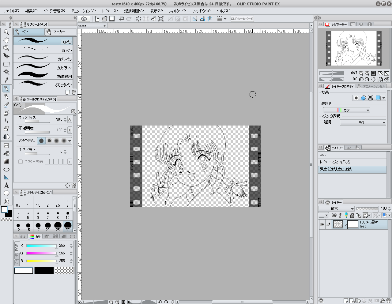 タイトル通りなのですが、レイヤーマスクに対して「輝度を明度に変換」をおこなうと アンドゥしてもカラー不透明度が戻りません。 たとえばこのようなカラー画像があるとします。(図1) ![]() 図1にレイヤーマスクを追加します。(図2) ![]() 図2のレイヤーマスクに対して、「編集」->「輝度を透明度に変換」を行います。(図3) ![]() この状態になってしまうとアンドゥしても、カラー情報と不透明度は消失したままとなります。(図4) ![]() アンドゥ(ヒストリーを遡る)操作を行ってもカラー情報などが戻らないままの現状況は 致命的な不具合と思われますので注意喚起をお願いいたします。 図3の状態でアンドゥを行ったら図2に戻るのが理想です。 ------------------------------------------------------------ ■バージョン:ver 1.6.3 ※Windowsは、[ヘルプ]メニュー → [バージョン情報]で確認できます。 ※MacOSXは、[CLIP STUDIO PAINT]メニュー → [バージョン情報]で確認できます。 ■グレード DEBUT( ) comico( ) PRO( ) EX( ○ ) ■OS Windows XP( ○ ) Windows Vista( ) Windows 7 ( ○ ) Windows 8( ) Windows 8.1( ) Windows 10( ) MacOS X 10.5( ) MacOS X 10.6( ) MacOS X 10.7( ) MacOS X 10.8( ) MacOS X 10.9( ) MacOS X 10.10( ) MacOS X 10.11( ) mac OS 10.12( ) その他( ) ------------------------------------------------------------ |