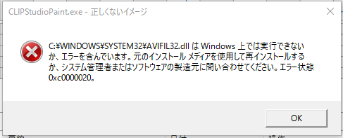 C:WINDOWS\SYSTEM32\AVIFIL32.dllはWindows上では実行できない か、エラーを含んでいます。元のインストールメディアを使用して再インストールする か、システム管理者またはソフトウェアの製造元に問い合わせてください。 エラー状態0xc0000020。