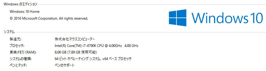 PCはマウスコンピュータ社からのオーダーメイドで