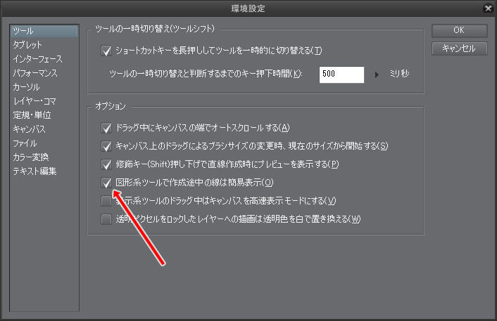 環境設定の「図形系ツールで作成途中の線は簡易表示」