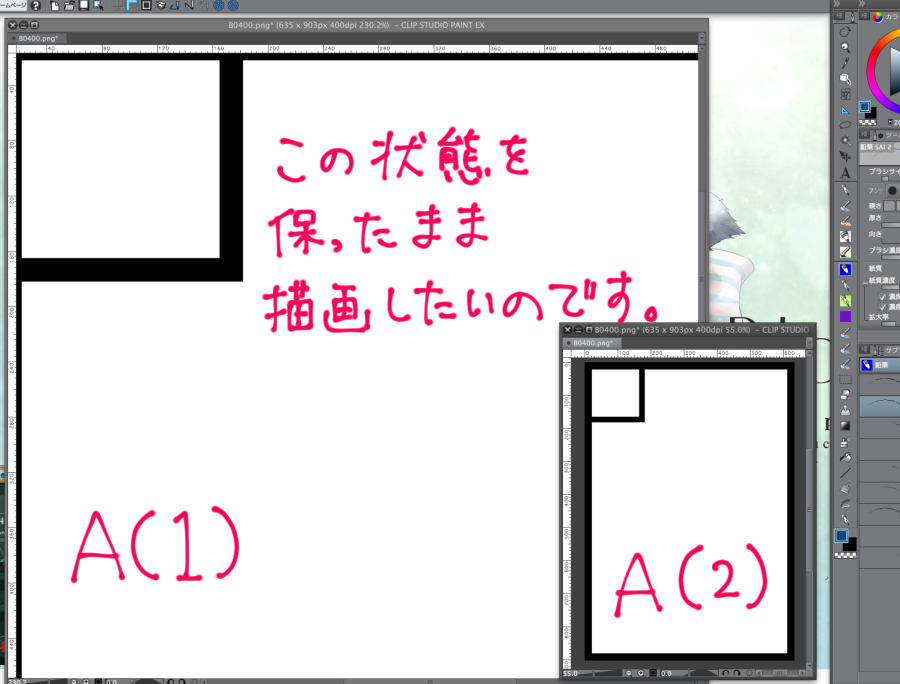 例えばA(1)の一部を拡大して描きながら、A(2)で常に全体を確認できるように表示しておきたいのです。
