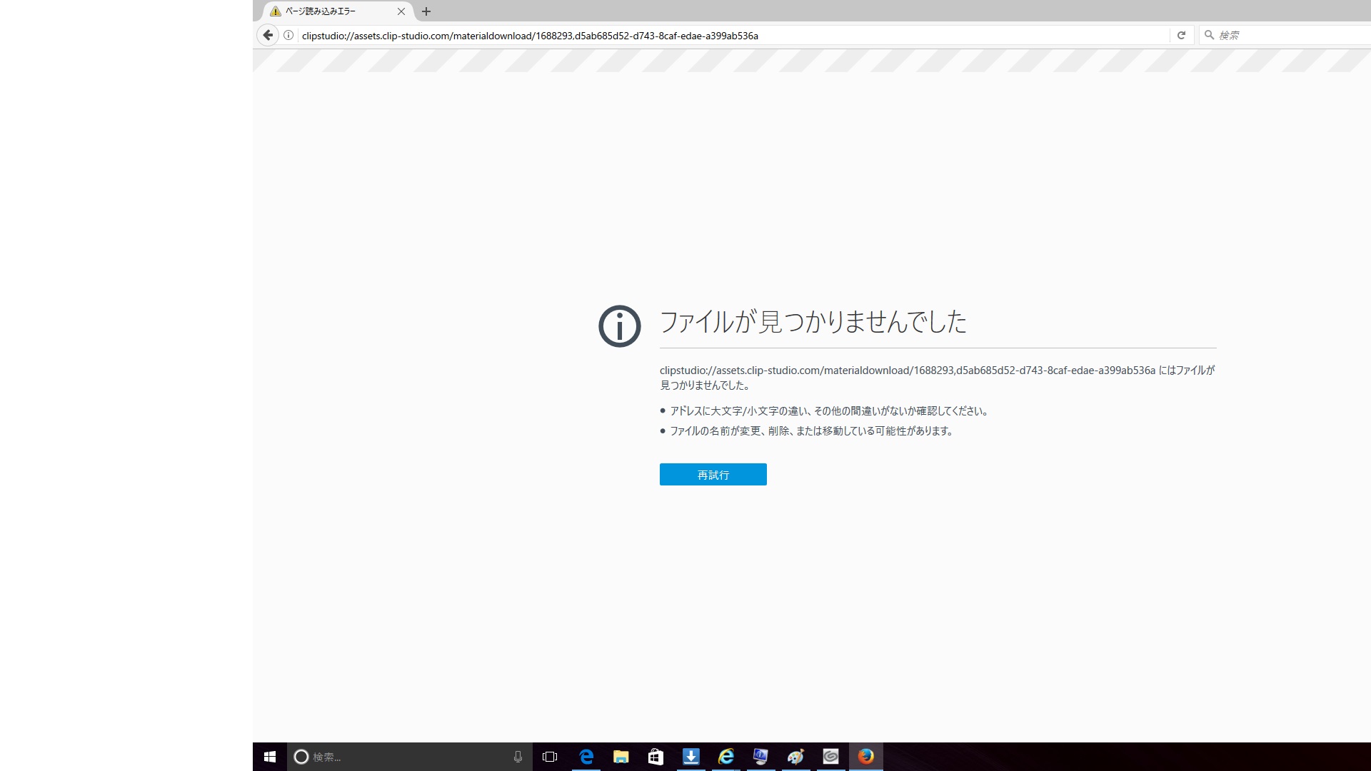 素材のダウンロードをクリックすると、ログインしているのにも関わらず「ログインしてください」という文字が表示されます。 Internet Explorerから試してみたところ、ログインはできるのですがタウンロードボタンをクリックしても何も反応がなく、いいねやマイリストをしようとしても「失敗しました」と表示されます。 firefoxでもやってみたのですが、今度はダウンロードボタンを押すと「ファイルが見つかりません」と表示され、やはりダウンロードすることができませんでした。なお、firefoxの場合いいねやマイリスト機能は正常に作動します。
