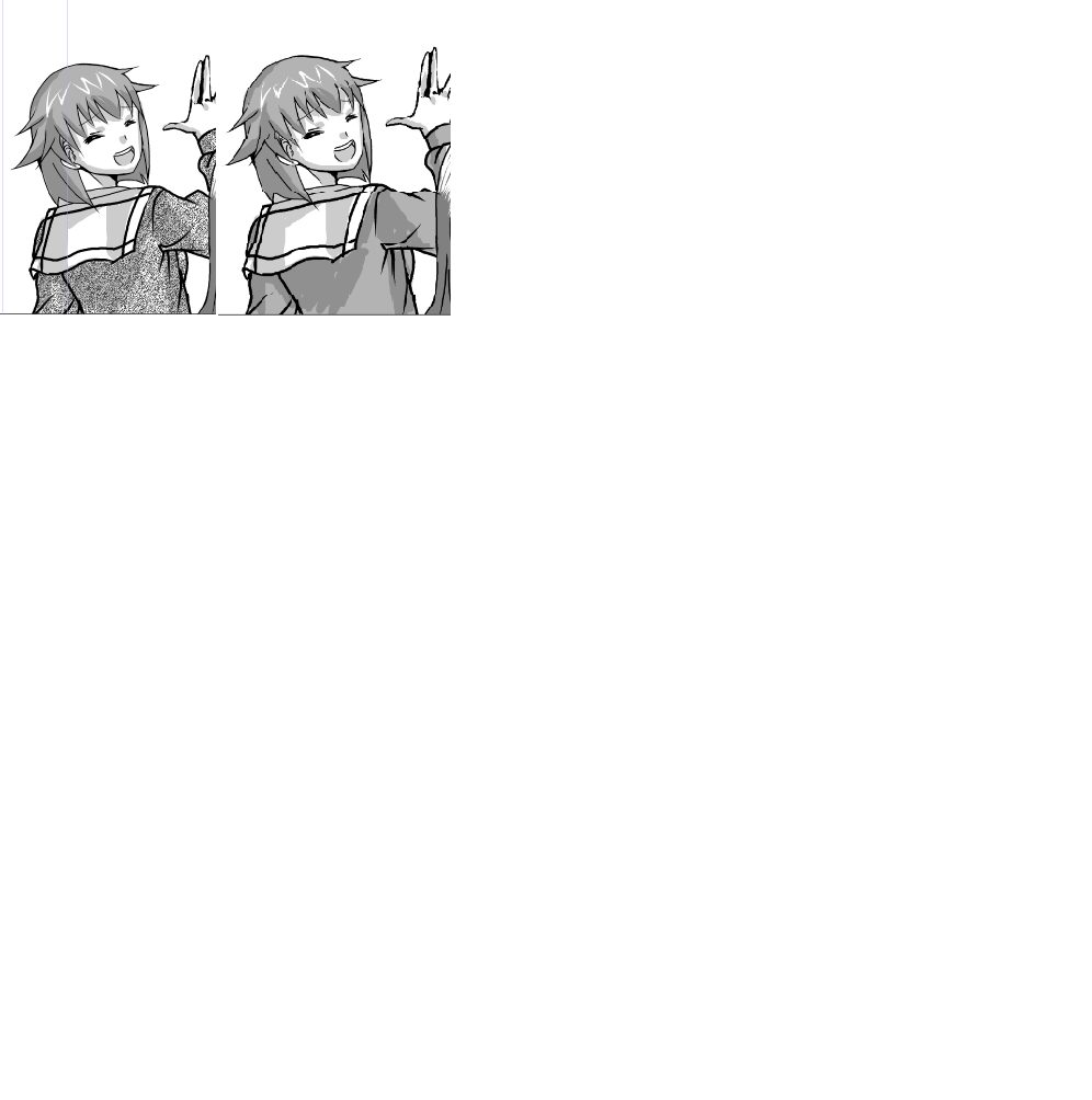 クリスタでの作業時に貼った砂目トーンが書き出し後にうまく表示されませんでした。これはランチャーでの簡易トーン設定「ノイズ」でも素材「砂目」からの貼り付けでも同様に通常のトーンとして出力されているように見えます。 書き出しは「グレースケール」元データからの拡縮率は24、11%出力サイズ指定は幅「1287」高さ「1800」の解像度600dpi拡大縮小時の処理は「イラスト向き」で出力を行いました。 ![]() ------------------------------------------------------------ ■バージョン:11,0,9600,18524 ※Windowsは、[ヘルプ]メニュー → [バージョン情報]で確認できます。 ※MacOSXは、[CLIP STUDIO PAINT]メニュー → [バージョン情報]で確認できます。 ■グレード DEBUT( ) comico( ) PRO( ) EX( ○ ) ■OS Windows XP( ) Windows Vista( ) Windows 7 ( ○ ) Windows 8( ) Windows 8.1( ) Windows 10( ) MacOS X 10.5( ) MacOS X 10.6( ) MacOS X 10.7( ) MacOS X 10.8( ) MacOS X 10.9( ) MacOS X 10.10( ) MacOS X 10.11( ) mac OS 10.12( ) その他( ) ------------------------------------------------------------ |