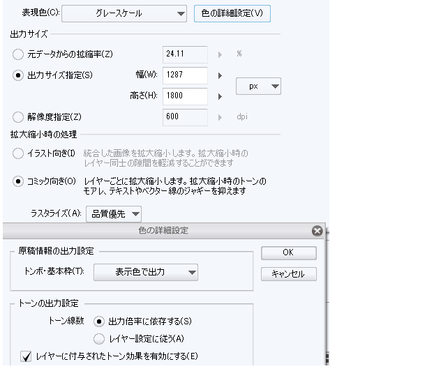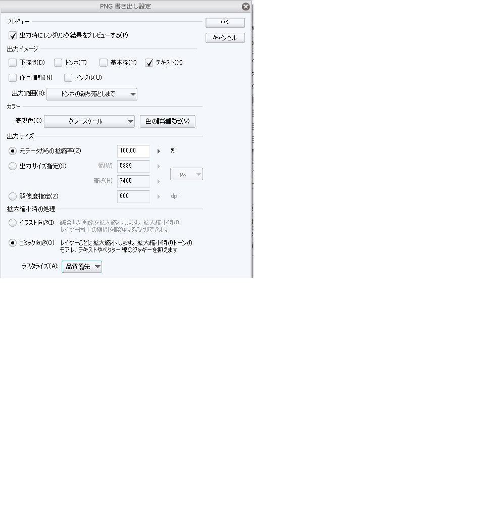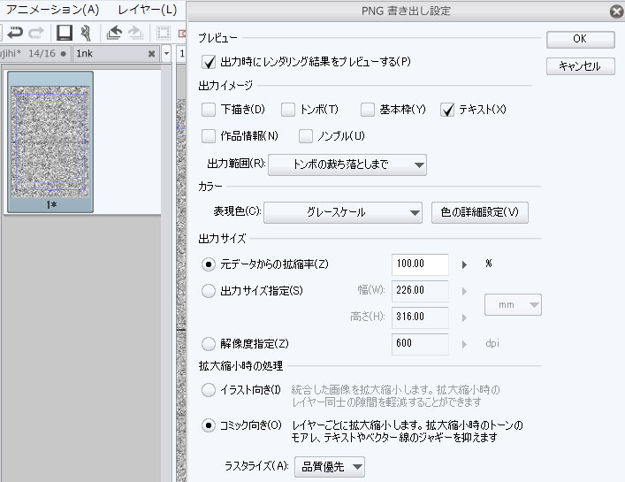 [コミック向き]、[品質優先]にした状態で書き出して、トーンが砂目で