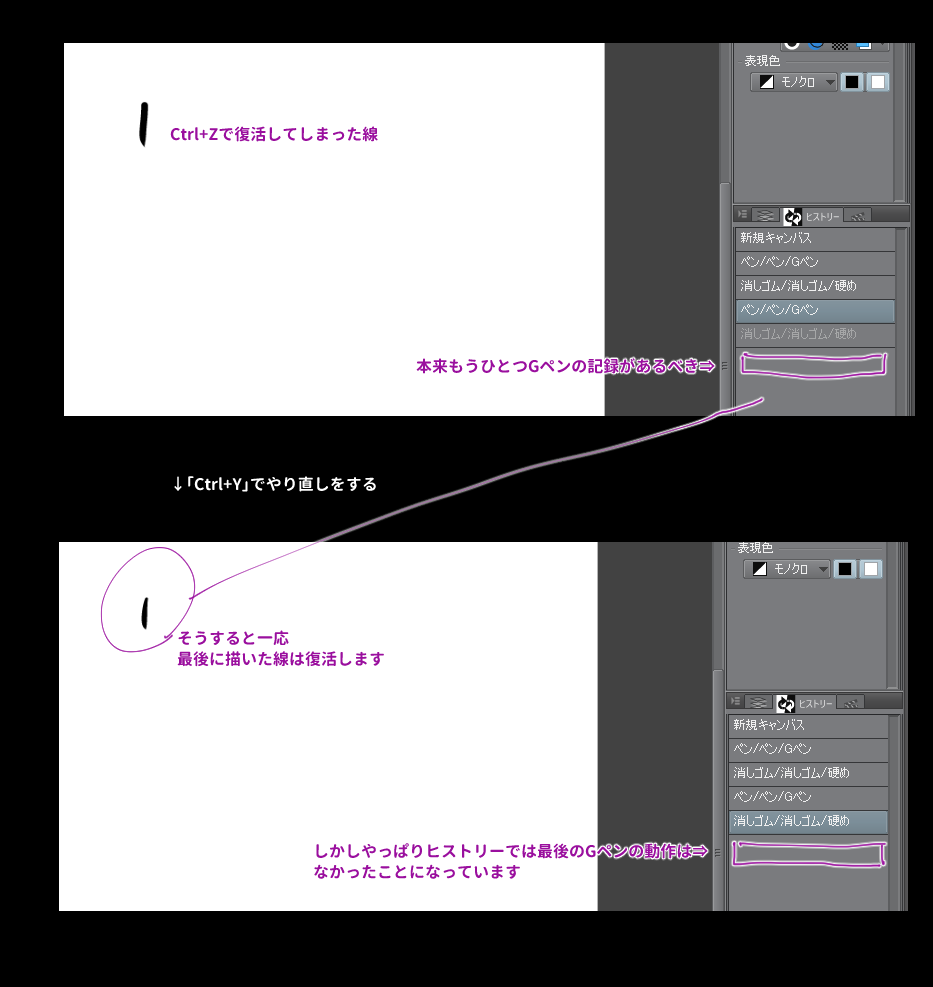 そもそも線を描いた時点でヒストリーには最後に描いた「ペン」の動作が記録されていなかったので、