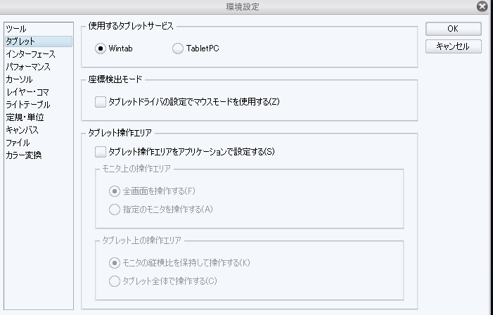・[ファイル]メニュー→[環境設定]を開き、[タブレット]を