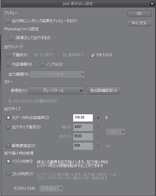 [漫画原稿設定]にチェックを入れて、[製品(仕上がり)サイズ]に