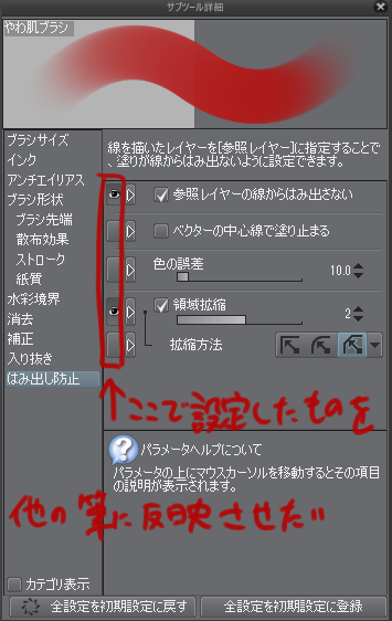 要望・質問です。 サブツールで設定した事項を、「鉛筆」や「Gペン」「水彩」etc等のツール毎に一括で反映できるようにして欲しいです。筆を一つひとつ設定するのはかなり手間ですので。 ![]() ------------------------------------------------------------ ■バージョン: ※Windowsは、[ヘルプ]メニュー → [バージョン情報]で確認できます。 ※MacOSXは、[CLIP STUDIO PAINT]メニュー → [バージョン情報]で確認できます。 ■グレード DEBUT( ) comico( ) PRO( ○ ) EX( ) ■OS Windows XP( ) Windows Vista( ) Windows 7 ( ) Windows 8( ) Windows 8.1( ) Windows 10( ○ ) MacOS X 10.5( ) MacOS X 10.6( ) MacOS X 10.7( ) MacOS X 10.8( ) MacOS X 10.9( ) MacOS X 10.10( ) MacOS X 10.11( ) mac OS 10.12( ) その他( ) ------------------------------------------------------------ |