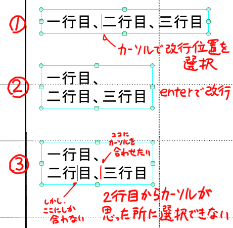 テキストエディタで改行の編集をした後、キャンパスで更に改行を行った時、二行目からカーソルが合わない |