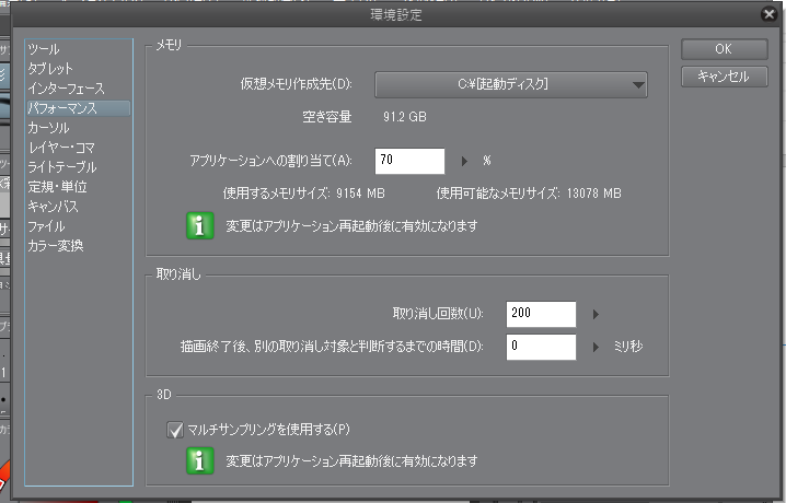 ・[ファイル]メニュー→[環境設定]を開き、[パフォーマンス]を