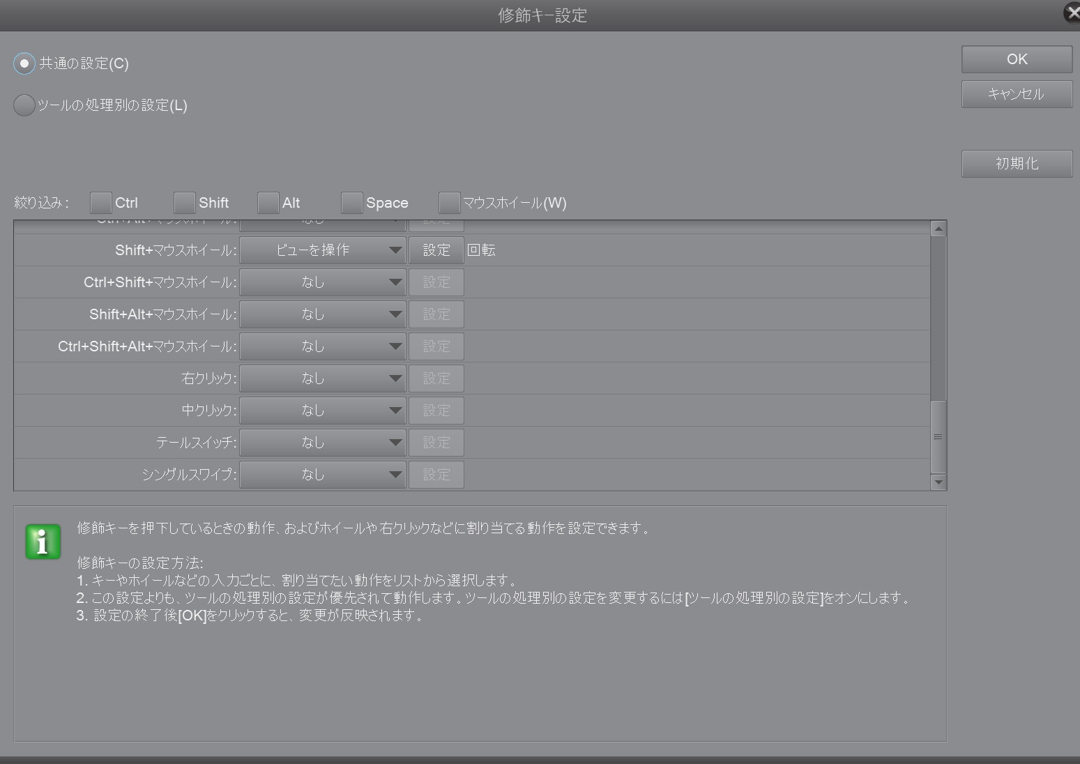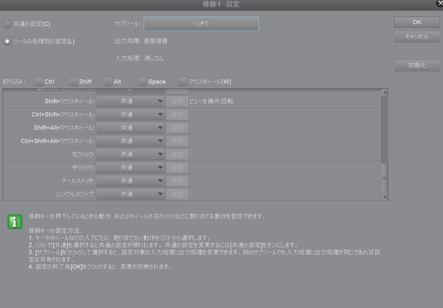 タイトルの通りです。 キャンバス外での操作、例えばツール選択やコマンドバーでのクリックなどをテールスイッチで行った場合は反応するのですが、キャンバス内での操作が一切ききません。 消しゴム機能も使えないですし、他のペンツールに変えても全く描画できませんでした。 他のイラストソフトでは問題なく使えますし、タブレットドライバでチェックしてみましたが、きちんと筆圧検知されてました。 クリップスタジオ、タブレットドライバ共に最新バージョンです。 原因の検討がつかず困っています。よろしくお願いします。 ------------------------------------------------------------ ■バージョン:1.6.6 ※Windowsは、[ヘルプ]メニュー → [バージョン情報]で確認できます。 ※MacOSXは、[CLIP STUDIO PAINT]メニュー → [バージョン情報]で確認できます。 ■グレード DEBUT( ) comico( ) PRO( ) EX( ○ ) ■OS Windows XP( ) Windows Vista( ) Windows 7 ( ) Windows 8( ) Windows 8.1( ) Windows 10( ○ ) MacOS X 10.5( ) MacOS X 10.6( ) MacOS X 10.7( ) MacOS X 10.8( ) MacOS X 10.9( ) MacOS X 10.10( ) MacOS X 10.11( ) mac OS 10.12( ) その他( ) ■ペンタブレット Intuos Pro( ) Intuos Comic( ) Intuos( ) Intuos4( ) Intuos5( ) Cintiq( ) Bamboo Fun( ) Bamboo Comic( ) XP-Pen( ) Mousepad Tablet( ) その他( ○ ) ■ペンタブレット モデル名(型番):DTH-W1320 ドライバのバージョン:6.3.22-6 ------------------------------------------------------------ |