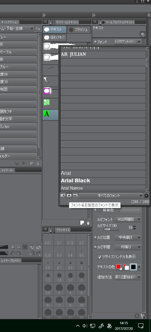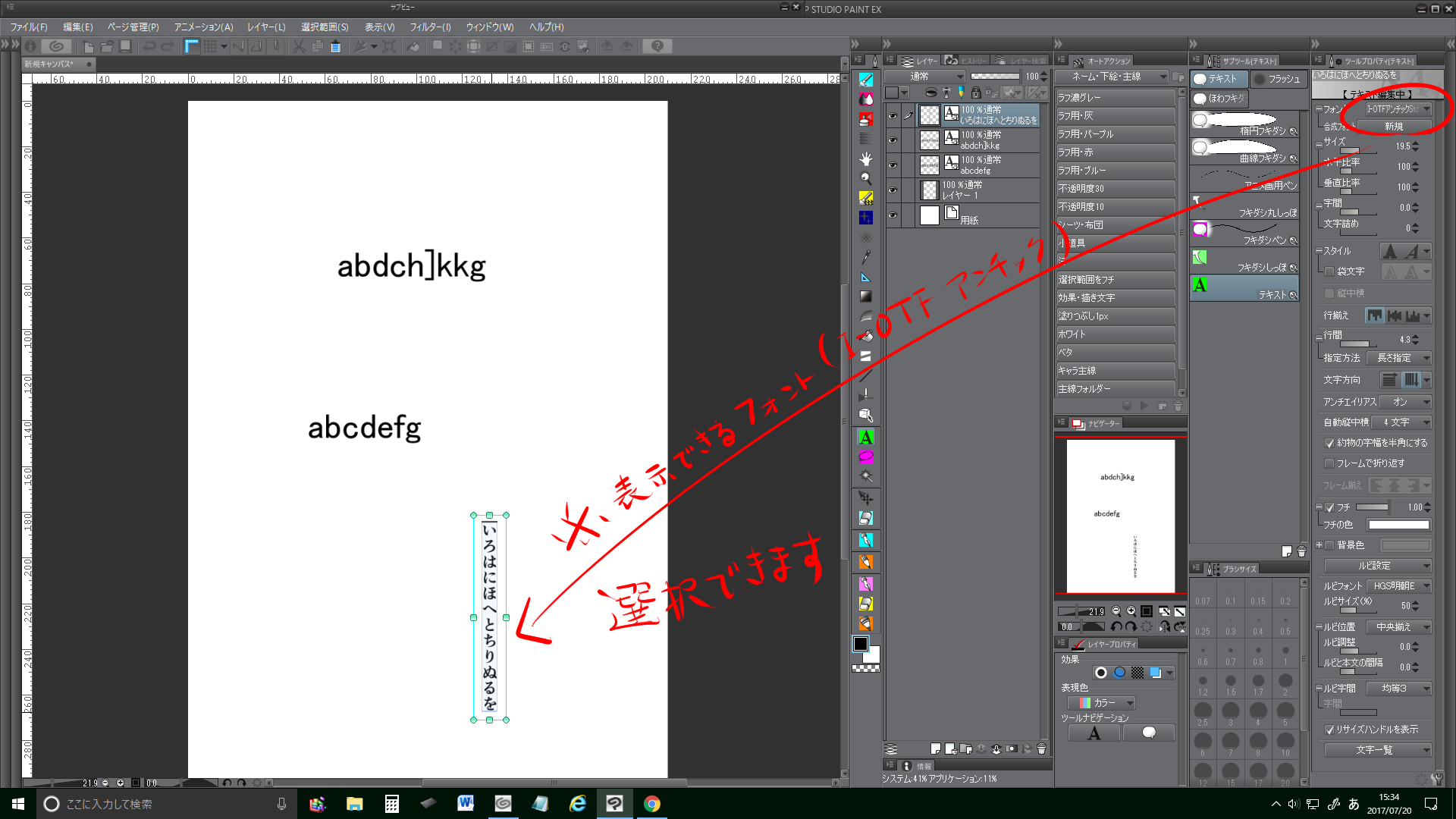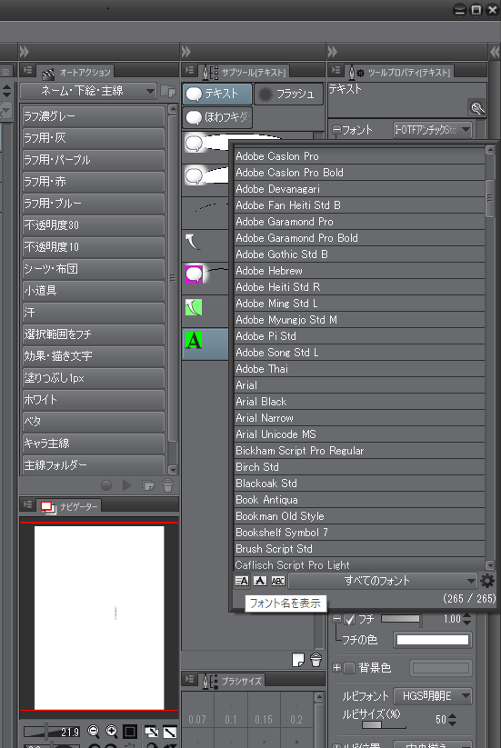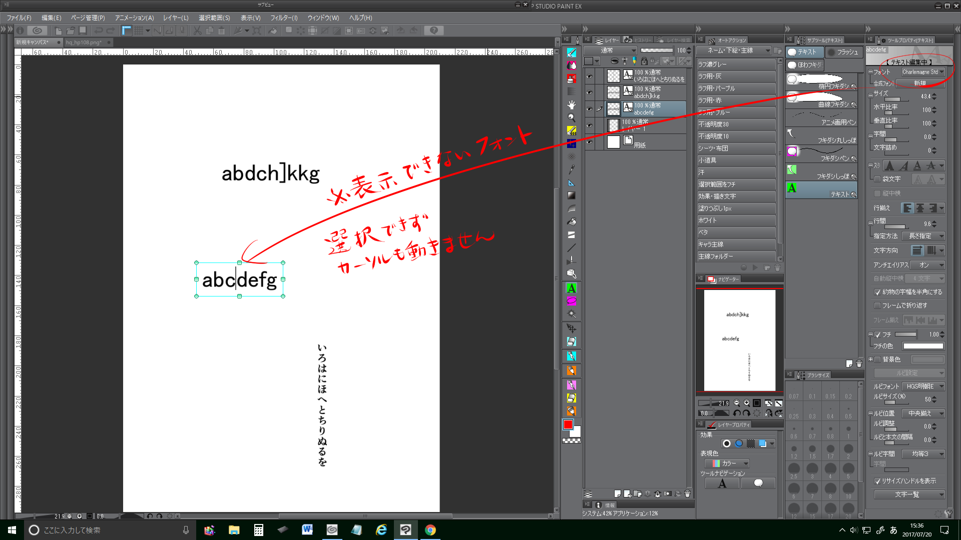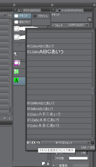 また、表示されないフォントについては、ペンタブまたはマウスで右を押したままでの[選択]も反応しない状態です。