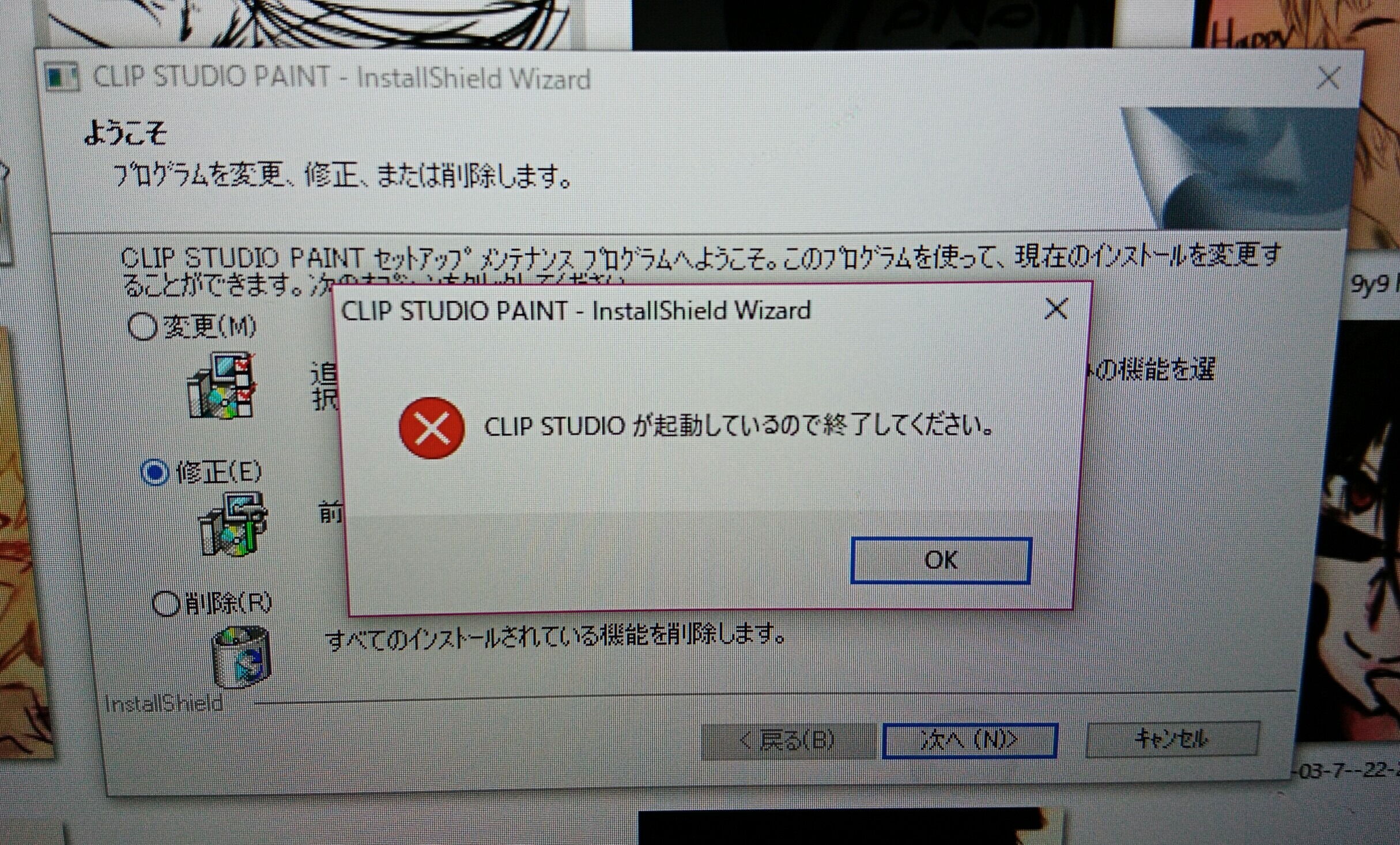「CLIP STUDIO PAINT ‐InstallShield Wizard ようこそ プログラムを変更、修正、または削除します。」と、変更、修正、削除の3つの選択肢が出てきます。その内の「修正」を選択すると再インストールされるという事なのでそちらを押すともう1枚の方の画像のように「CLIP STUDIOが起動しているので終了してください。」と出てきます。そちらの意味がよく理解できないです…。
