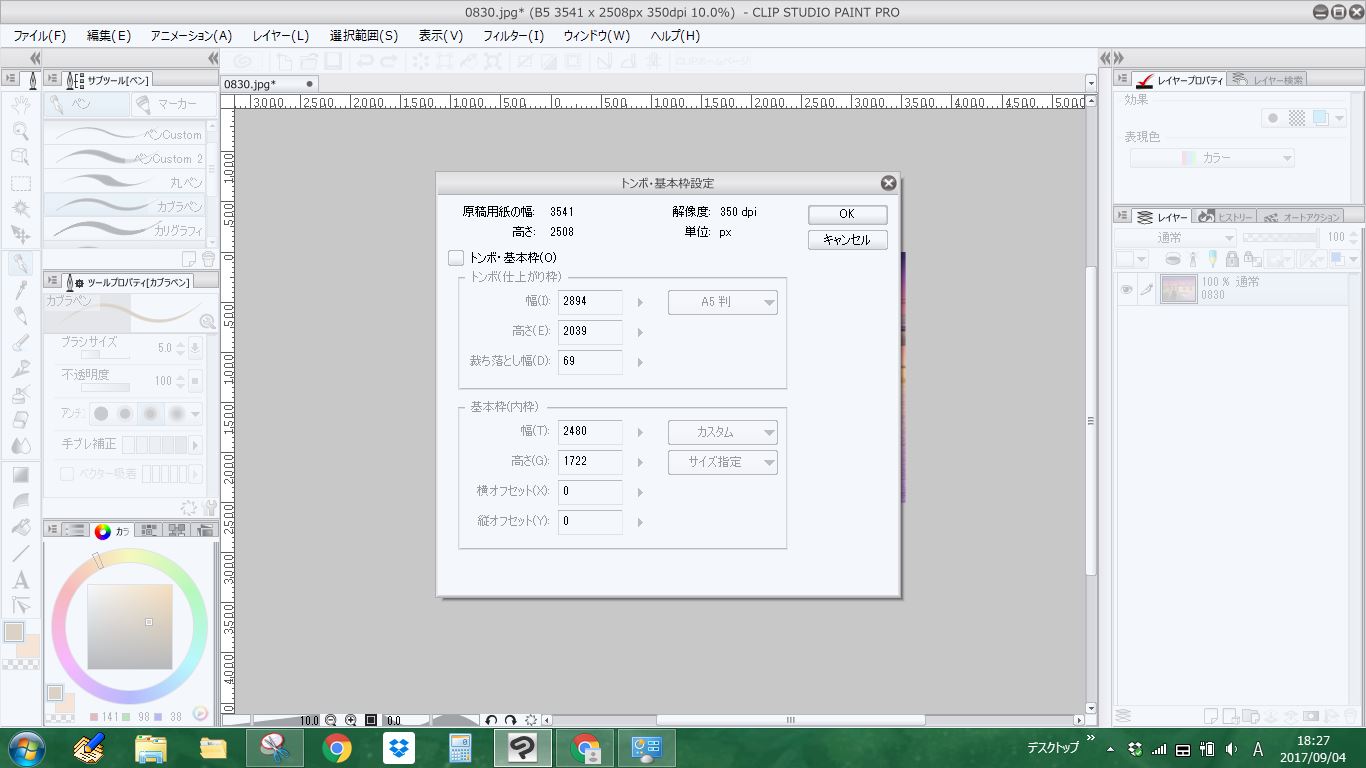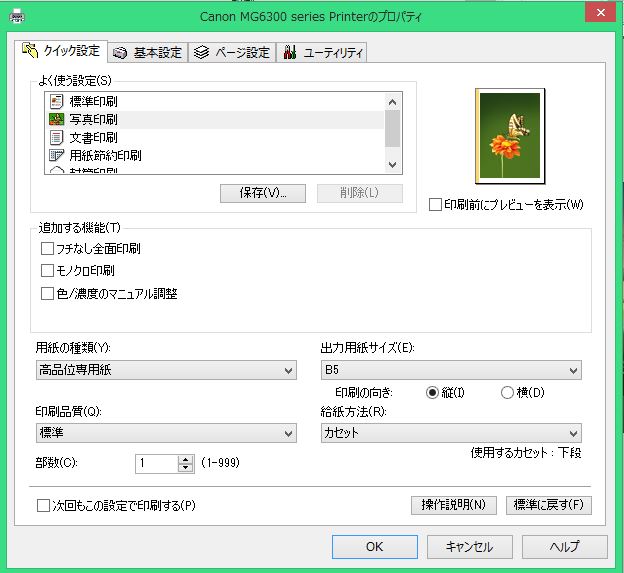 B5用紙への画像印刷についてです。 B5サイズいっぱいの画像を作成し、B5サイズのインクジェット用紙にプリントしたところ、用紙の右端2~3cmが切れた状態で印刷されてしまいました。 CLIP STUDIO PAINT側の設定もしくはプリンター側の設定で改善出来るならば教えていただきたいです。 使用プリンターはCanonのMG6300、画像解像度は350dpi、CLIP STUDIO PAINTの印刷サイズ設定は実寸でした。 ------------------------------------------------------------ ■バージョン:1.6.3 ■グレード DEBUT( ) comico( ) PRO( ○ ) EX( ) ■OS Windows XP( ) Windows Vista( ) Windows 7 ( ) Windows 8( ) Windows 8.1( ○ ) Windows 10( ) MacOS X 10.5( ) MacOS X 10.6( ) MacOS X 10.7( ) MacOS X 10.8( ) MacOS X 10.9( ) MacOS X 10.10( ) MacOS X 10.11( ) mac OS 10.12( ) その他( ) ------------------------------------------------------------ |