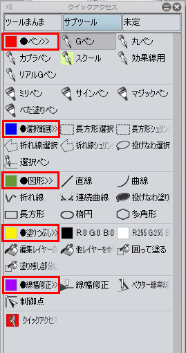 後は、クイックアクセス内でツールを選択してサブツールを表示するところにきました。