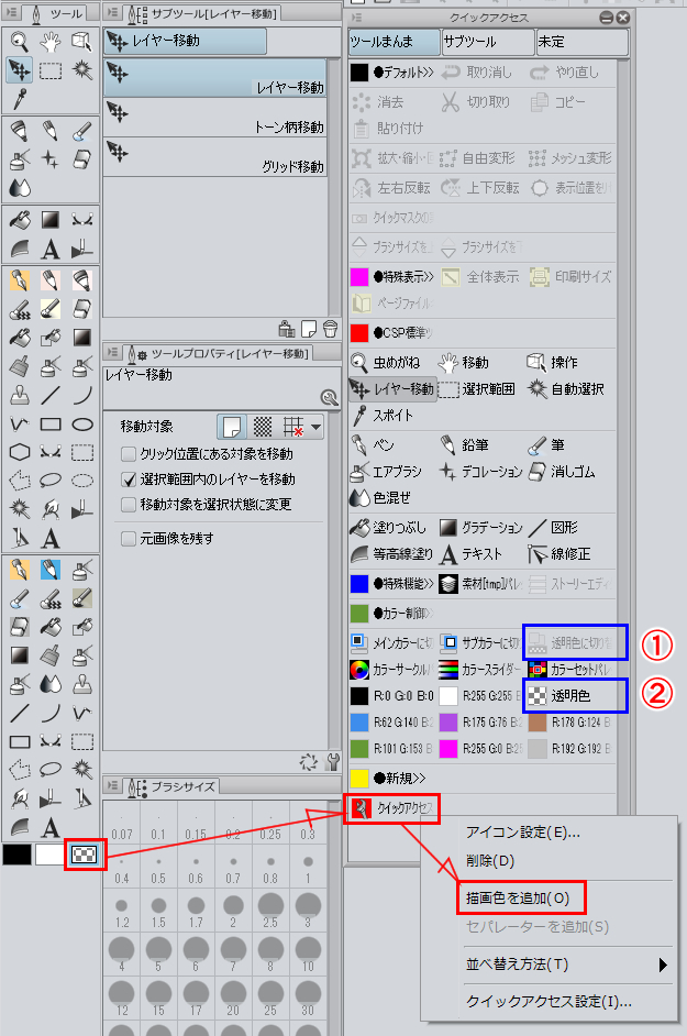 早速、機能を確かめようと、クリスタのツールのみをクイックアクセスに追加して、