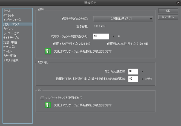 [パフォーマンス]内の[マルチサンプリングを使用する]の