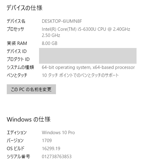 左側で[バージョン情報]を選択し、画面右側で[バージョン]と[OSビルド]