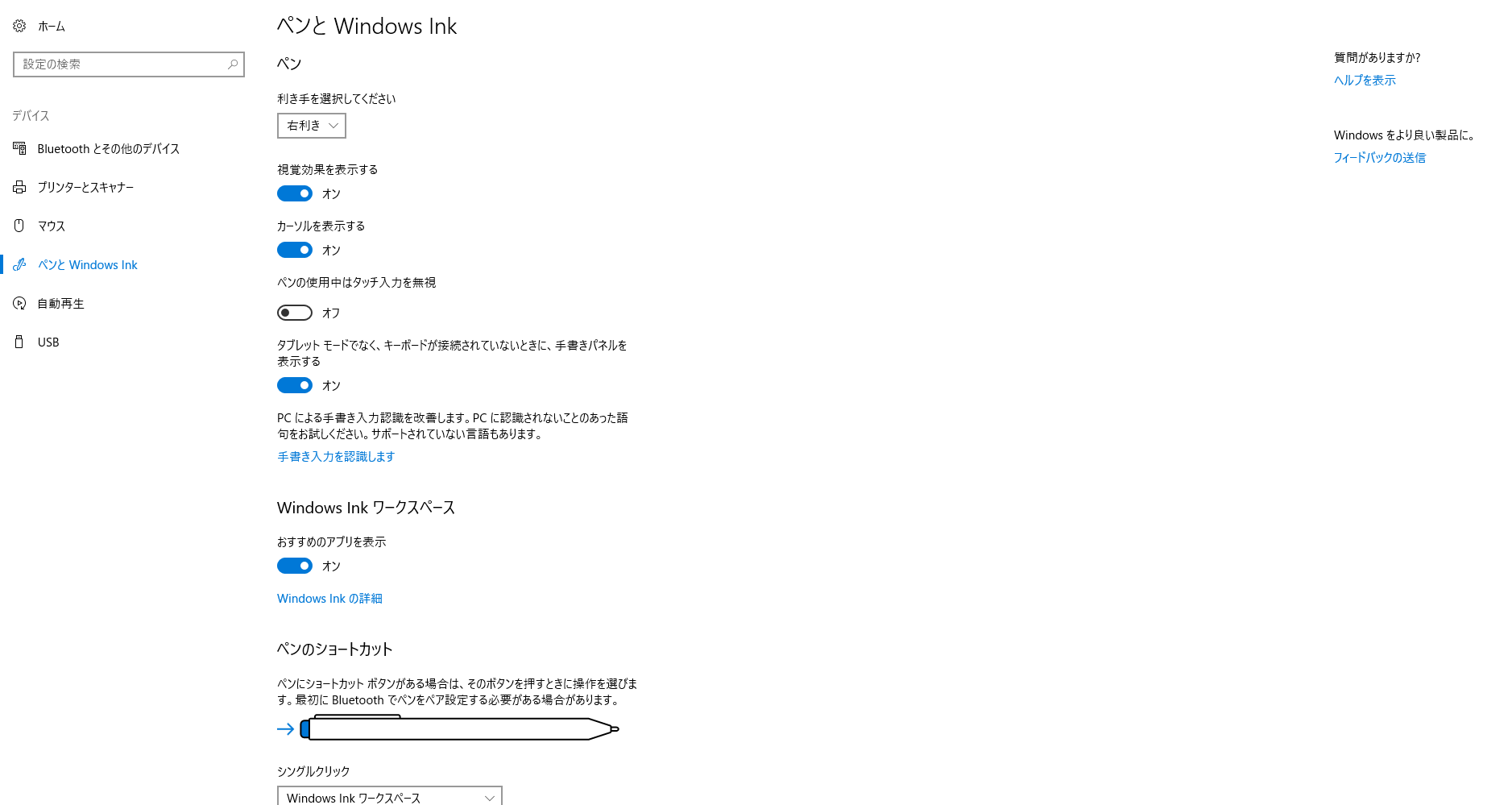 左側で[ペンとWindows Ink]の順に選択すると表示されるページのすべての