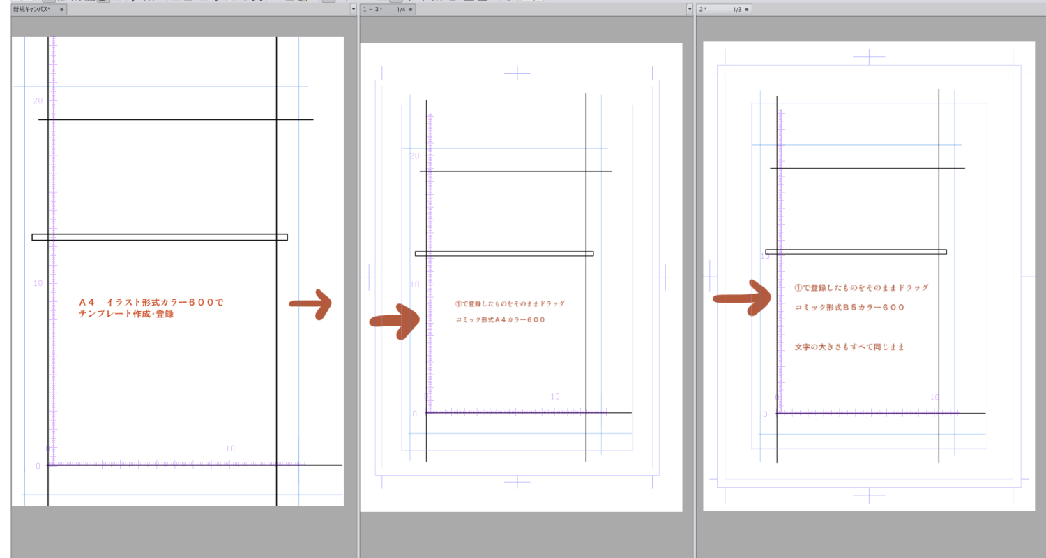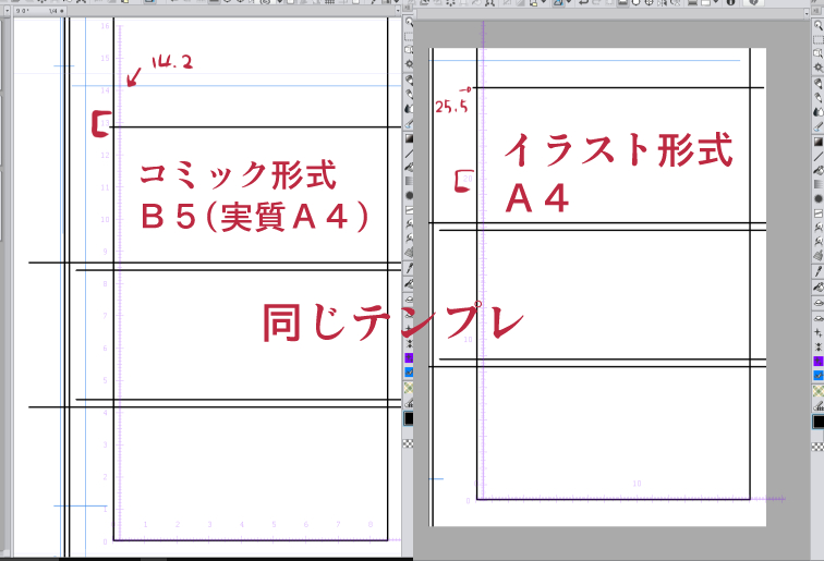 「商業誌用」というサイズも出したようですが、A4,B5などはどうなってるのかもわかりません。 テンプレート登録したものも、違う用紙サイズのものに貼ると、大きさが違ったりします。