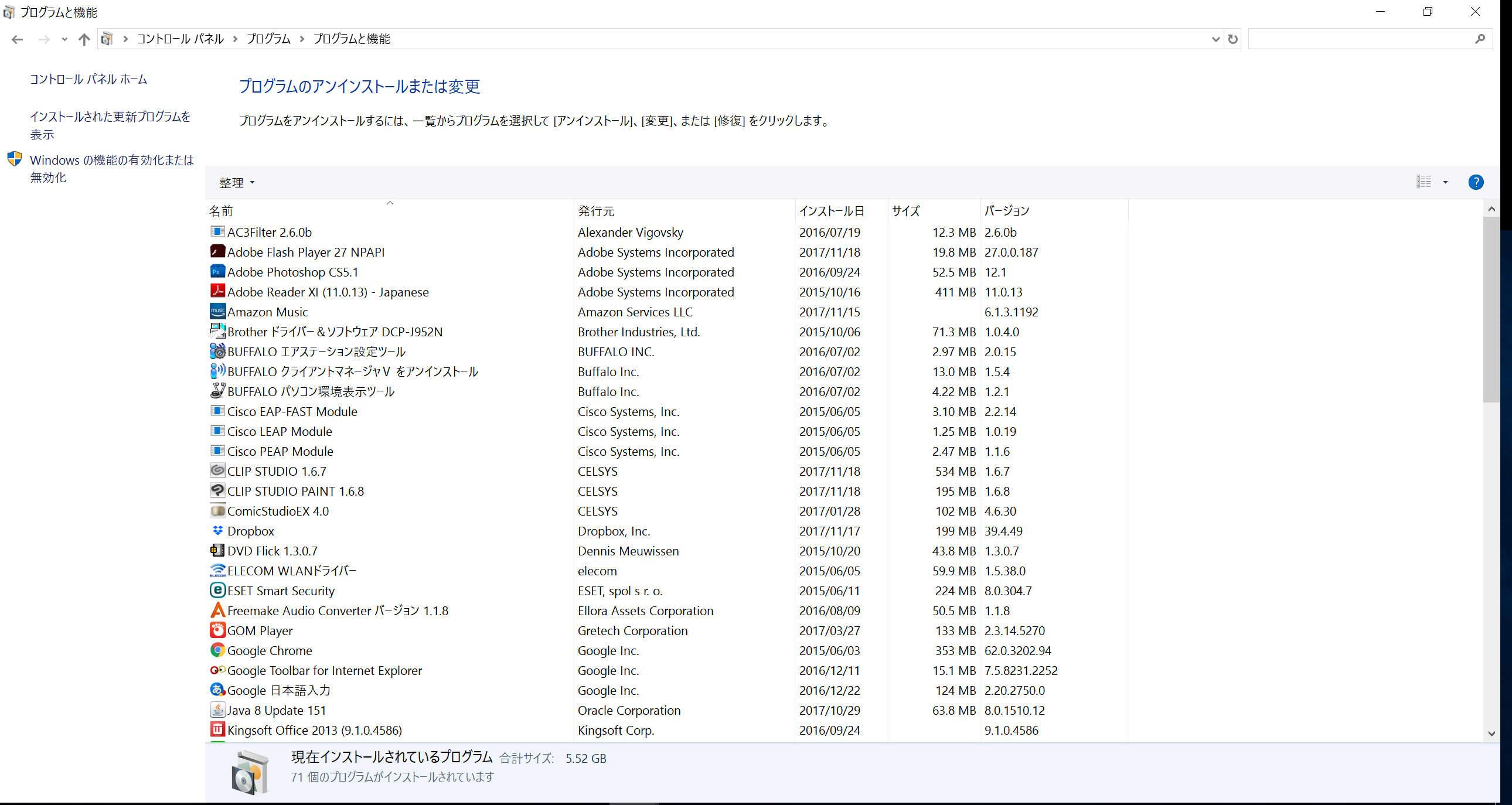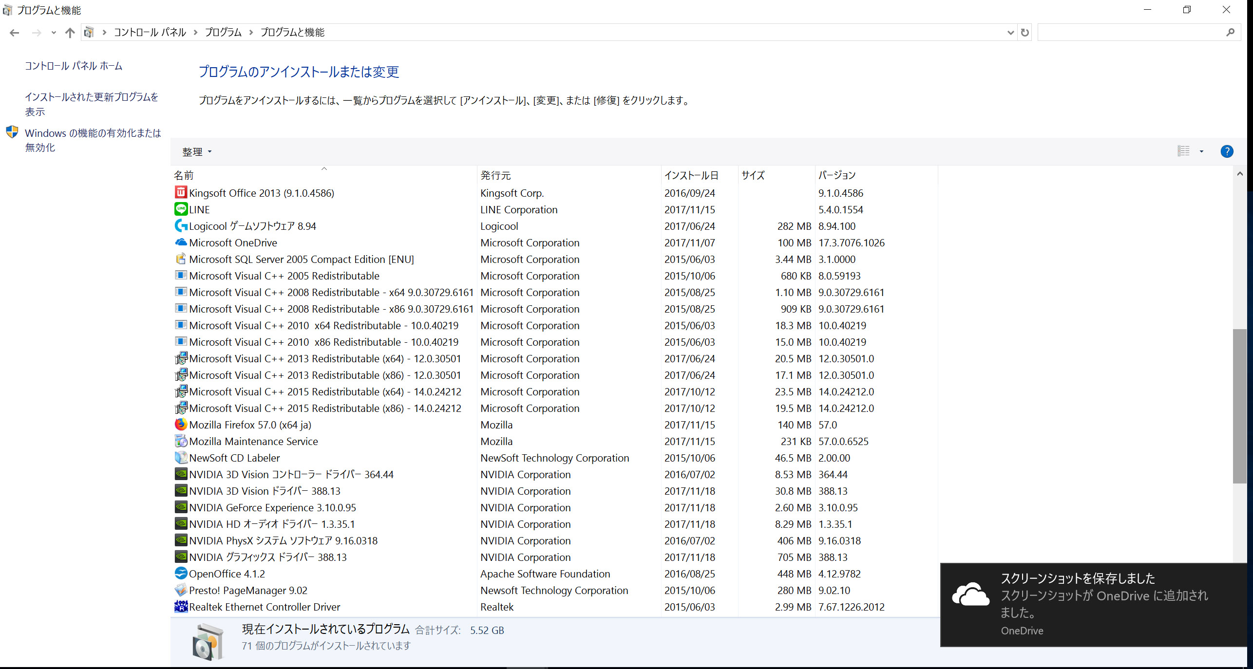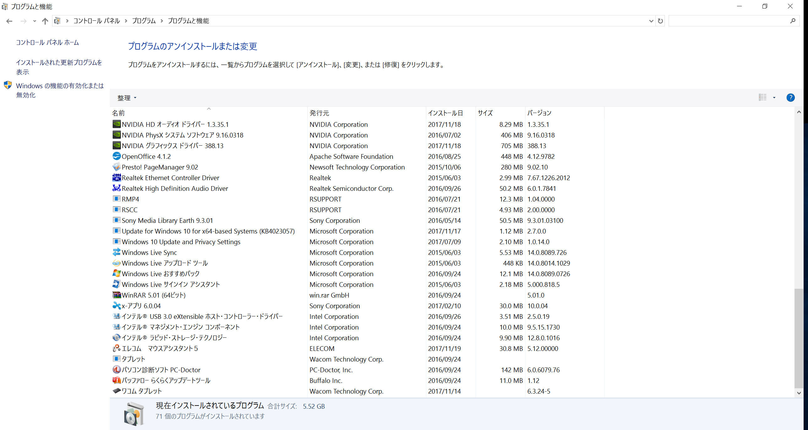 (プログラムと機能)]を選択して表示される画面のすべての項目が