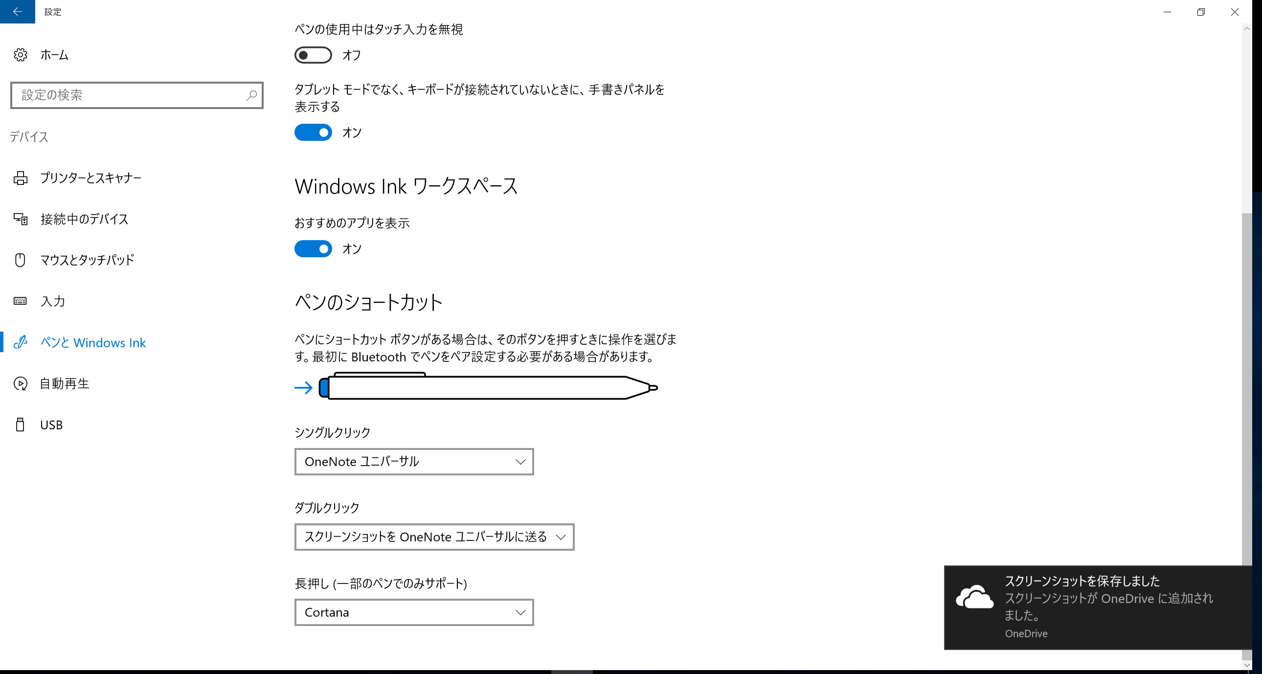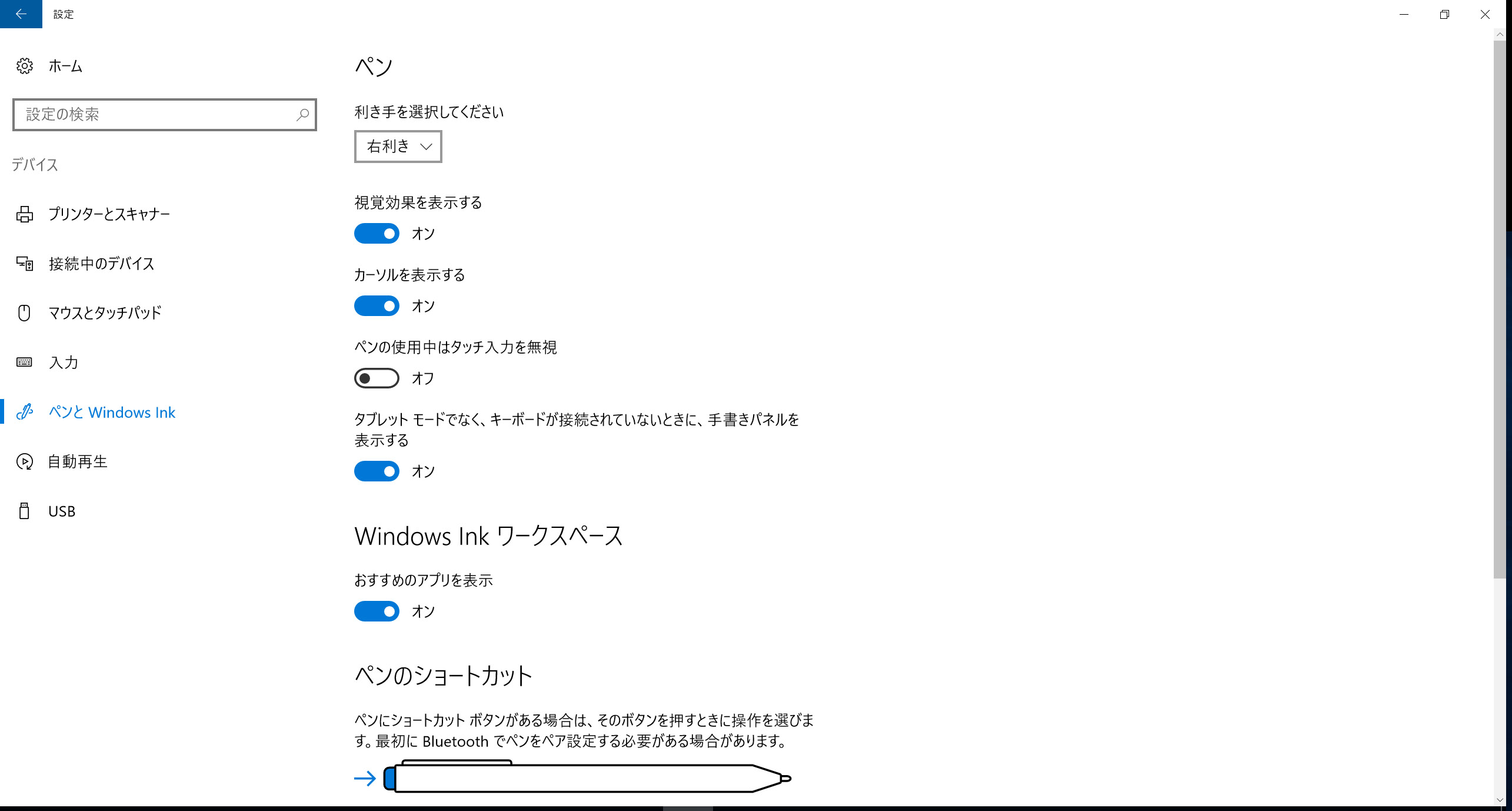 左側で[ペンとWindows Ink]の順に選択すると表示されるページのすべての