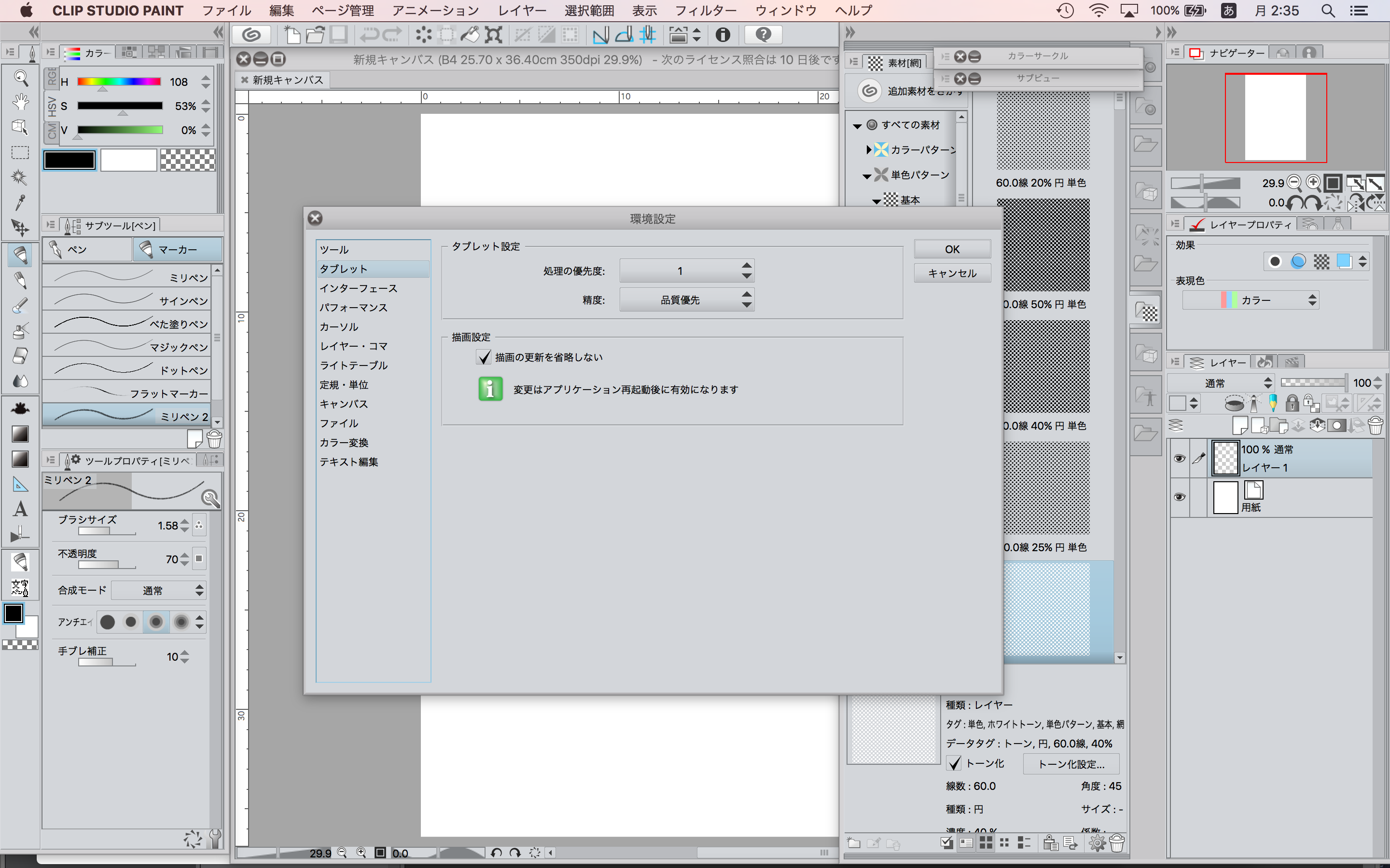 お世話になっております。 PCを変えたところ、線が描画されない時があります。 全てが描画されないというわけではなく、描いている途中、突然一画がペイントソフトに反映されなくなります。 画像でいうと、右の「時」の「日」の二画目です。 描いても感知されません。 おそらくペイントソフトの問題だと思うのですが、どうすれば直りますか? ![]() ------------------------------------------------------------ ■バージョン: ※Windowsは、[ヘルプ]メニュー → [バージョン情報]で確認できます。 ※MacOSXは、[CLIP STUDIO PAINT]メニュー → [バージョン情報]で確認できます。 ※iPadは、[CLIP STUDIO PAINT]アイコン → [バージョン情報]で確認できます。 ■グレード DEBUT( ) comico( ) PRO( ) EX( 1.6.7) ■OS Windows XP( ) Windows Vista( ) Windows 7 ( ) Windows 8( ) Windows 8.1( ) Windows 10( ) MacOS X 10.5( ) MacOS X 10.6( ) MacOS X 10.7( ) MacOS X 10.8( ) MacOS X 10.9( ) MacOS X 10.10( ) MacOS X 10.11( ) mac OS 10.12( ○) mac OS 10.13( ) iOS 11( ) その他( ) ------------------------------------------------------------ |