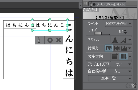 お世話になっております。 ストーリーエディターを使用していて使いづらい箇所がありましたので 報告させていただきます。 キャンバスを新規作成し、 ストーリーエディターを開き、 連続で3行文字を入力したところ、 画像のようになります。 普段はフォントサイズ15、文字方向は縦書きで使用しています。 ![]() まず、1行目についてです。 リサイズハンドルは縦方向となっていますが、 いつも使うフォントサイズではなく、 文字方向が横書きになっています。 ![]() 次に2行目以降です。 1行目とは逆にフォントサイズはいつも使っているもので文字方向も縦ですが、 リサイズハンドルが横方向になっています。 ![]() ストーリーエディターのマニュアルを拝見しましたところ、 文字方向は縦書きでもリサイズハンドルが横方向になっていないようでした。 また、「テキストにツールプロパティを適用」が テキストツールを選択している状態でも グレーアウトして使うことができません。 ![]() お忙しい中とは存じますが 調査していただけると助かります。 何卒よろしくお願い致します。 ------------------------------------------------------------ ■バージョン: ※Windowsは、[ヘルプ]メニュー → [バージョン情報]で確認できます。 ※MacOSXは、[CLIP STUDIO PAINT]メニュー → [バージョン情報]で確認できます。 ※iPadは、[CLIP STUDIO PAINT]アイコン → [バージョン情報]で確認できます。 ■グレード DEBUT( ) comico( ) PRO( ) EX( 1.7.1 ) ■OS Windows XP( ) Windows Vista( ) Windows 7 ( ) Windows 8( ) Windows 8.1( ) Windows 10( ○ ) MacOS X 10.5( ) MacOS X 10.6( ) MacOS X 10.7( ) MacOS X 10.8( ) MacOS X 10.9( ) MacOS X 10.10( ) MacOS X 10.11( ) mac OS 10.12( ) mac OS 10.13( ) iOS 11( ) その他( ) ------------------------------------------------------------ |