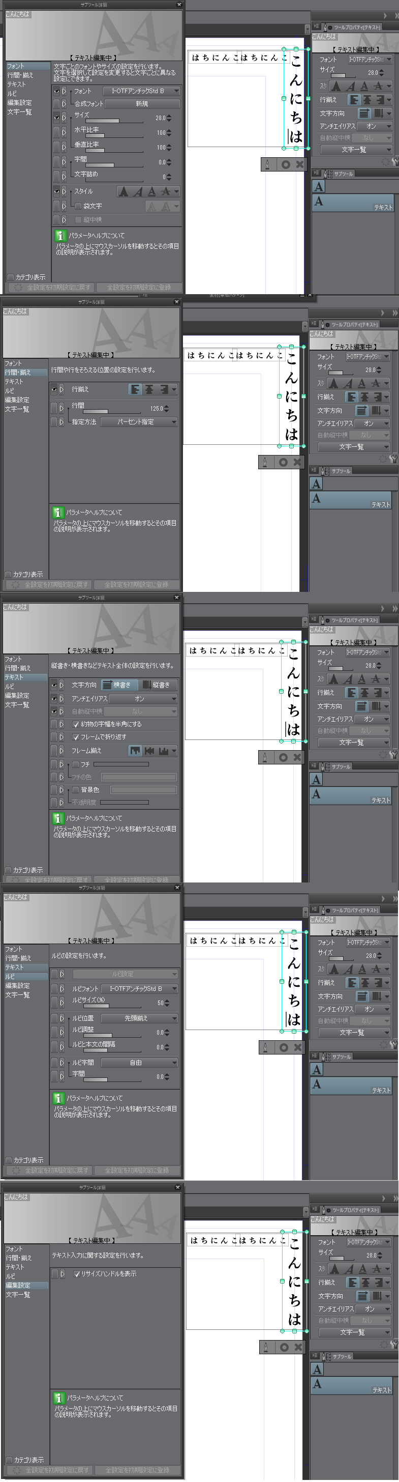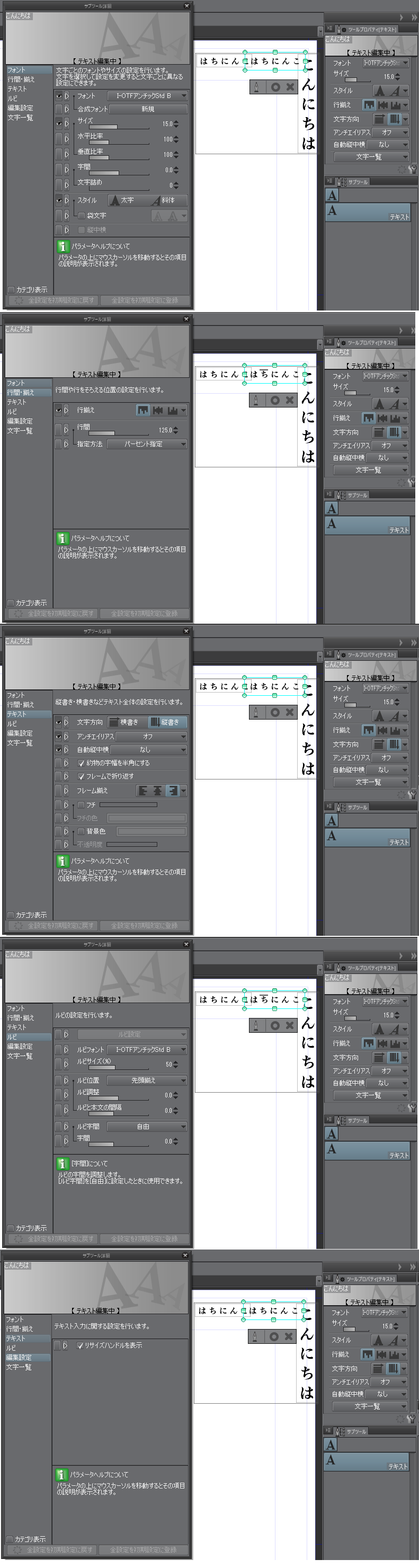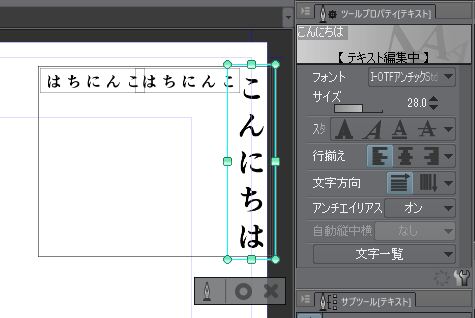 ・「テキスト」ツールを選んだ状態で、「ウィンドウ」メニューから「サブツール詳細」パレットを