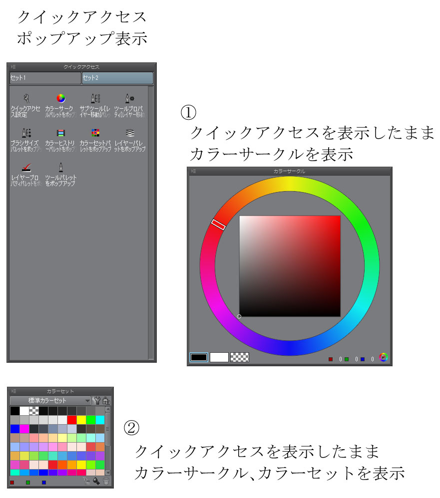・[クイックアクセス設定]→[メインメニュー]→[ウインドウ]→[任意のパレット]をクイックアクセスに設定しておくとポップアップしても閉じません。