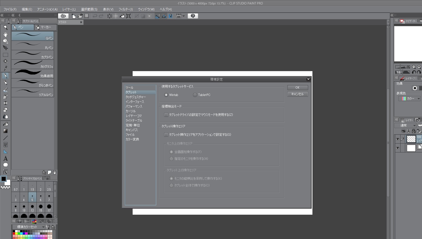 ・CLIP STUDIO PAINTを起動し、[ファイル]メニュー→[環境設定]を選択して、