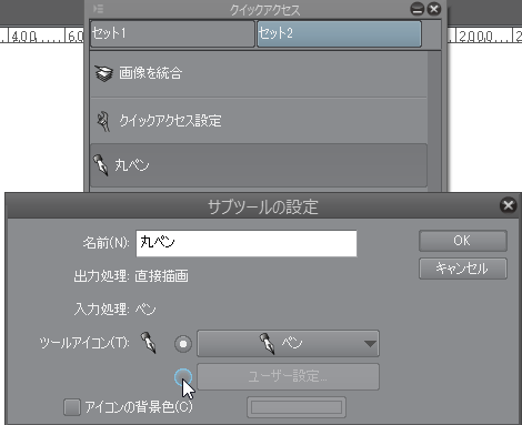 クイックアクセスの「丸ペン」を長押しして表示される「サブツール設定」を