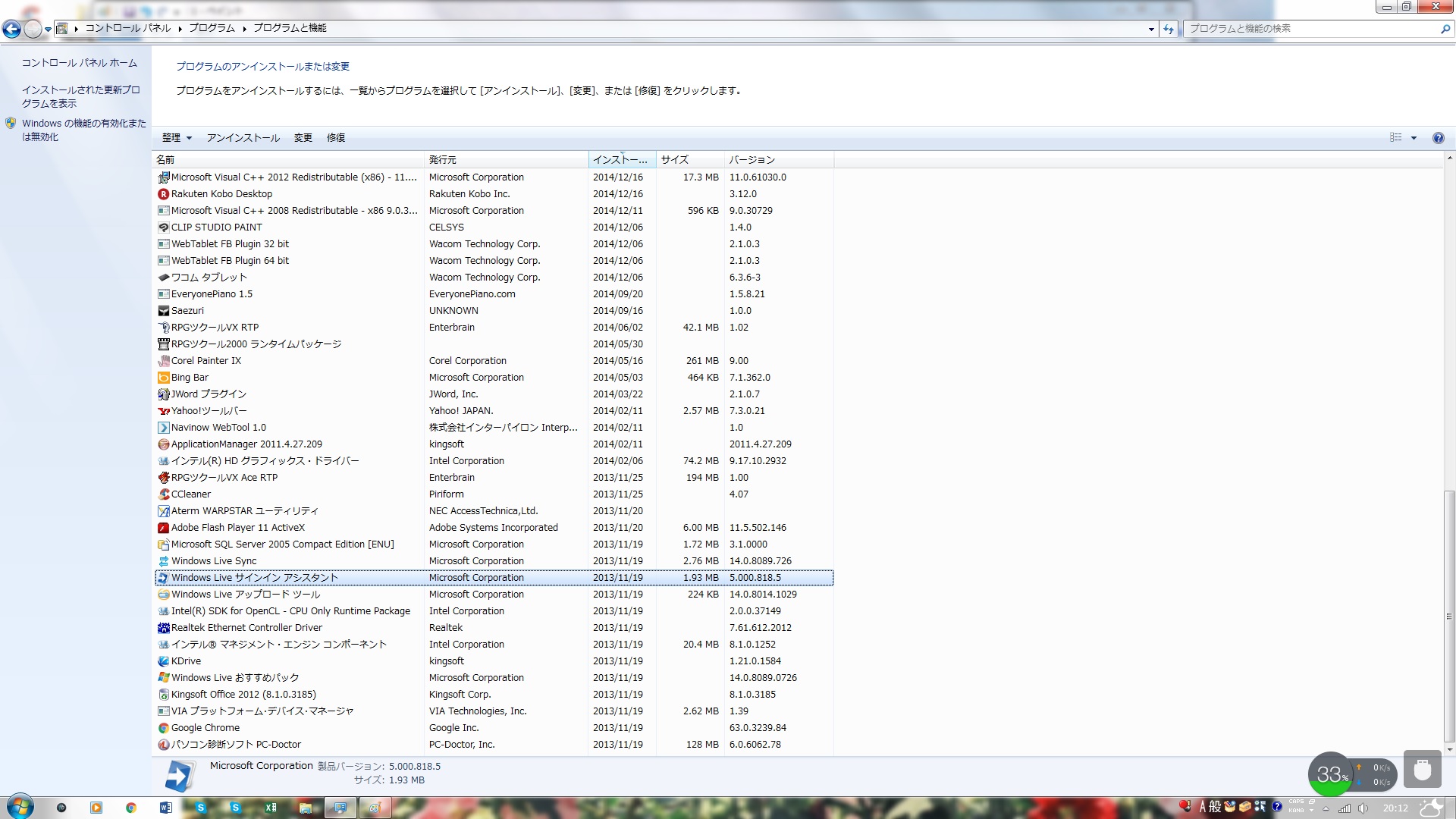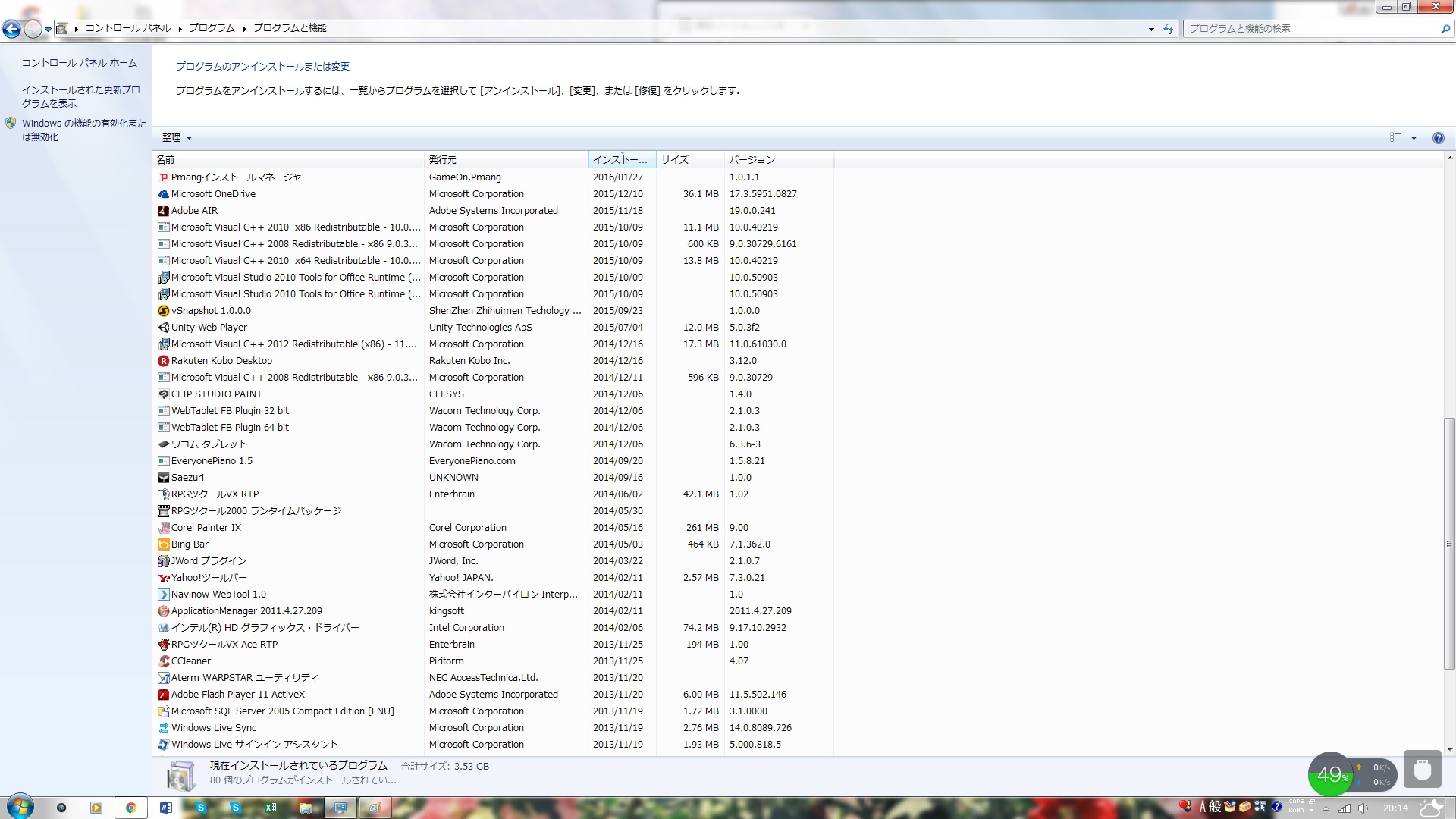・[Windowsスタート]→[コントロールパネル]→[プログラムと機能