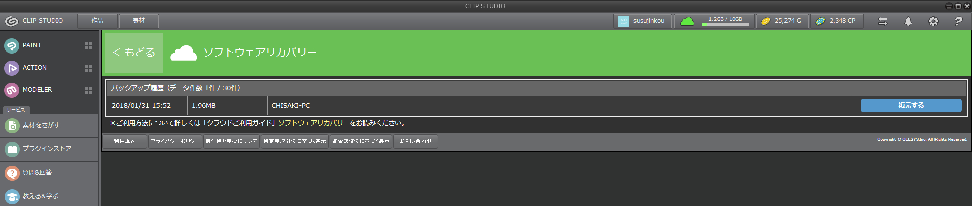 クラウド設定で「作品の同期を利用する」を選択、設定を保存 同期したい作品の「クラウド同期設定 ON」 …の状態にしてあるのですが、これまで一度もクラウドのソフトフェアリカバリーにデータがバックアップされていません。 クリップスタジオ終了時には『データを同期しますか?』のダイアログが出ており、「はい」を選択、通信も行われています。クリップスタジオに表示されているクラウドのデータ使用容量も順当な値です。 ですが、ソフトウェアリカバリーを開くと「バックアップされたデータはありません」…となっています。 素材についても同様な事が起こり、データがバックアップされません。 どのような対処をすれば宜しいでしょうか? ------------------------------------------------------------ ■バージョン:1.7.3 ※Windowsは、[ヘルプ]メニュー → [バージョン情報]で確認できます。 ※MacOSXは、[CLIP STUDIO PAINT]メニュー → [バージョン情報]で確認できます。 ※iPadは、[CLIP STUDIO PAINT]アイコン → [バージョン情報]で確認できます。 ■グレード DEBUT( ) PRO( ) EX( ○ ) ■OS Windows XP( ) Windows Vista( ) Windows 7 ( ○ ) Windows 8( ) Windows 8.1( ) Windows 10( ) MacOS X 10.5( ) MacOS X 10.6( ) MacOS X 10.7( ) MacOS X 10.8( ) MacOS X 10.9( ) MacOS X 10.10( ) MacOS X 10.11( ) mac OS 10.12( ) mac OS 10.13( ) iOS 11( ) その他( ) ------------------------------------------------------------ |