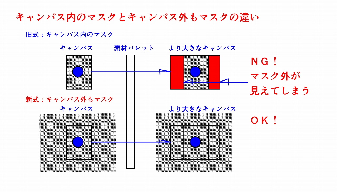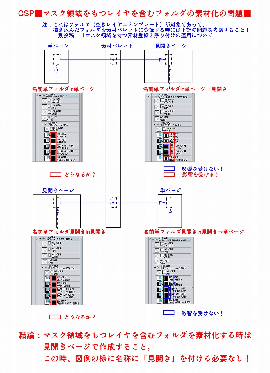 テンプレートとして、 マスク領域をもつレイヤを含むフォルダ(空きレイヤのみ)を素材パレットに登録する時に、 単ページで作成したものを見開きページに貼り付ける場合と、 見開きページで作成したものを単ページに貼り付ける場合とで不都合がありますので 検証をしてみました。(添付図を参照)