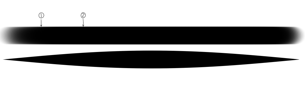 ○概要 次の設定で直線を引いた際、ブラシ濃度の入り抜きは中央付近まで影響する事を期待しましたが、実際には左右1/4辺りまでになっています。 また、ペンの先端形状に影響するのかもしれませんが、中央は早々にRGB(0,0,0)になってしまっています。これももう少し粘って欲しいのですが…。 ○設定 ・デフォルトの「Gペン」を使用 ・ブラシサイズの筆圧影響先設定はOFF ・入り抜きの設定は次の通り 入り抜き影響先設定:ブラシ濃度(最小値0) 指定方法:パーセント指定 入り:50 抜き:50 ○結果 ![]() 上記「1」の部分で中央のRGB値が(0,0,0)になっています。 上記「2」の部分で外縁のRGB値が(0,0,0)になっています。 下段は参考用に「入り抜き影響先設定」に「ブラシサイズ」を設定して描画した線です。こちらは期待通りの入り抜きが行われている様子が見て取れます。 ------------------------------------------------------------ ■バージョン: 1.7.2(64) ■グレード DEBUT( ) PRO( ) EX( ○ ) ■OS Windows XP( ) Windows Vista( ) Windows 7 ( ○ ) Windows 8( ) Windows 8.1( ) Windows 10( ) MacOS X 10.5( ) MacOS X 10.6( ) MacOS X 10.7( ) MacOS X 10.8( ) MacOS X 10.9( ) MacOS X 10.10( ) MacOS X 10.11( ) mac OS 10.12( ) mac OS 10.13( ) iOS 11( ) その他( ) ------------------------------------------------------------ |